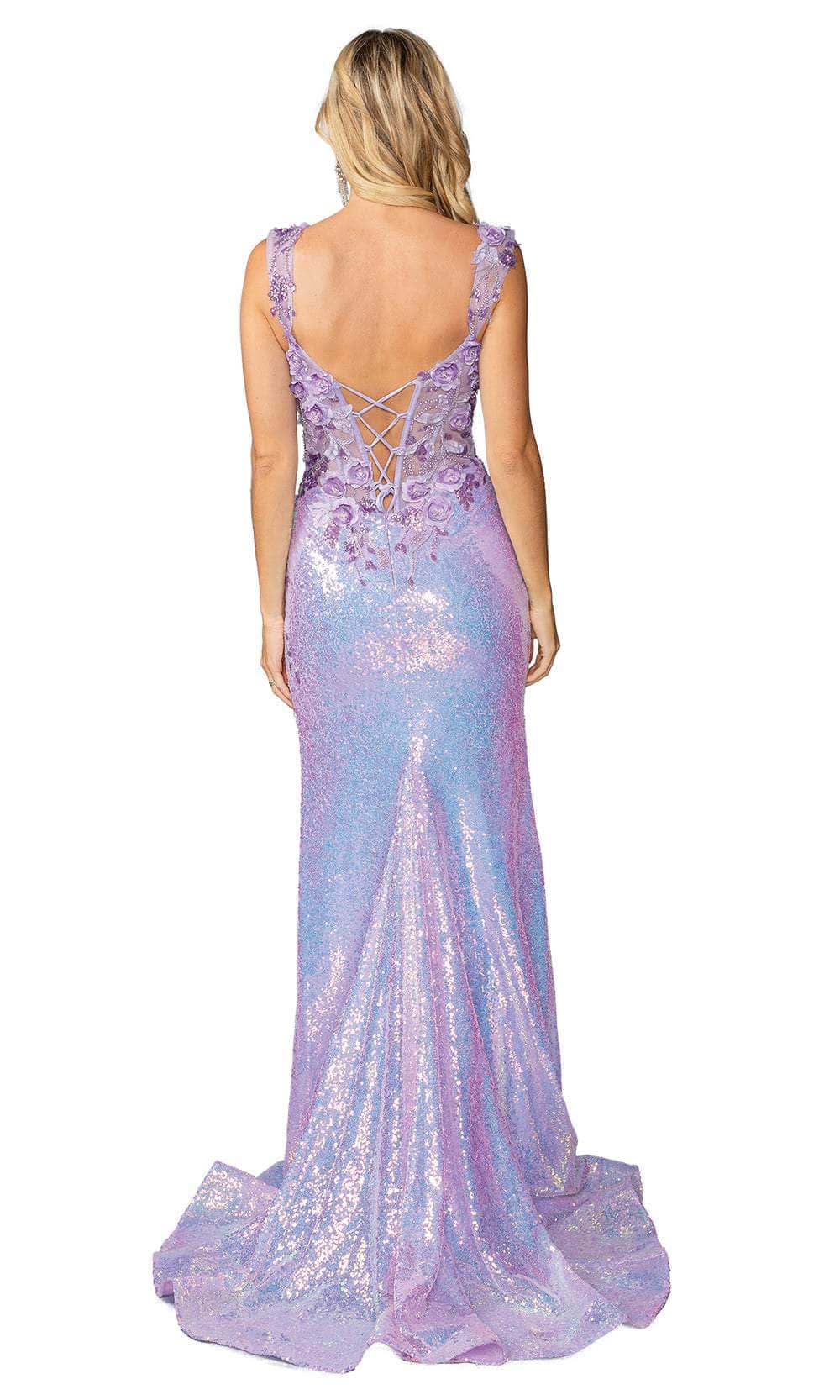 Exude ethereal beauty with this Dancing Queen 4423 ballgown. The sleeveless sheer bodice is adorned with enchanting 3D floral appliques and delicate beads, creating a mesmerizing effect. A graceful V-neckline adds a touch of sophistication, while wide supportive straps lead to a lace-up tie and a practical center zipper closure at the back. The floor-length sheath silhouette features a daring high slit, imparting a hint of allure, and culminates with a sweeping train. This Dancing Queen 4423 is a perfect choice for those who seek a blend of glamour and grace at any formal event. Model is wearing Lilac color.