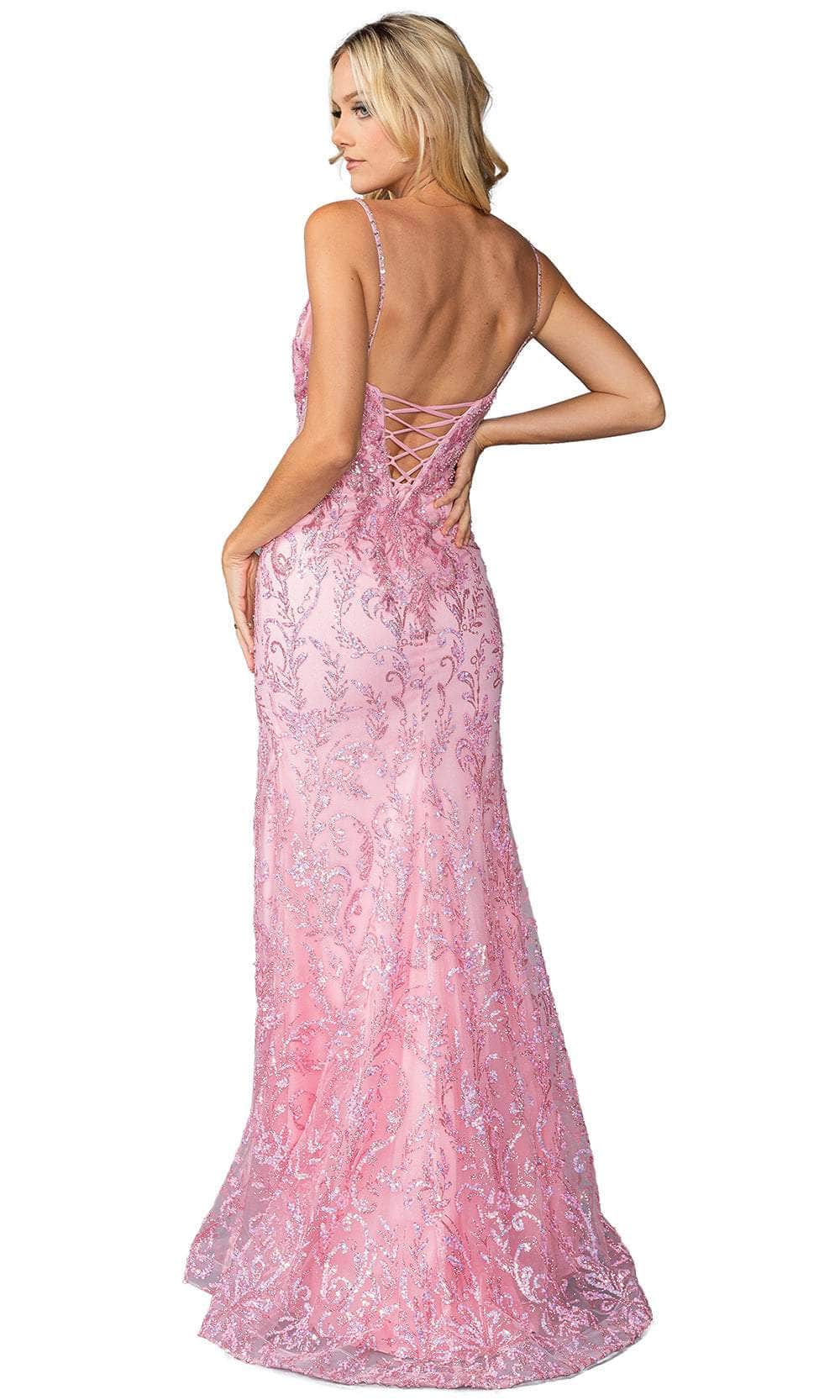 Steal the spotlight as you enter the red carpet in this gown from Dancing Queen 4426. Brimming with charm and sparkle, the sleeveless gown is decorated with a combination of beads, sequins, and foliage lace appliques. The deep v-neckline and spaghetti straps beautifully highlight your shoulders. A peek of skin is shown by the open back v-shaped design and has a lace-up closure to ensure a customized fit. With its high slit and horsehair hem that adds a dash of drama, the sheath skirt elevates your hourglass shape and ends in a sweeping train. Be the ultimate belle of the party in this lovely gown from Dancing Queen 4426. Models are wearing the Champagne, and Blush colors.