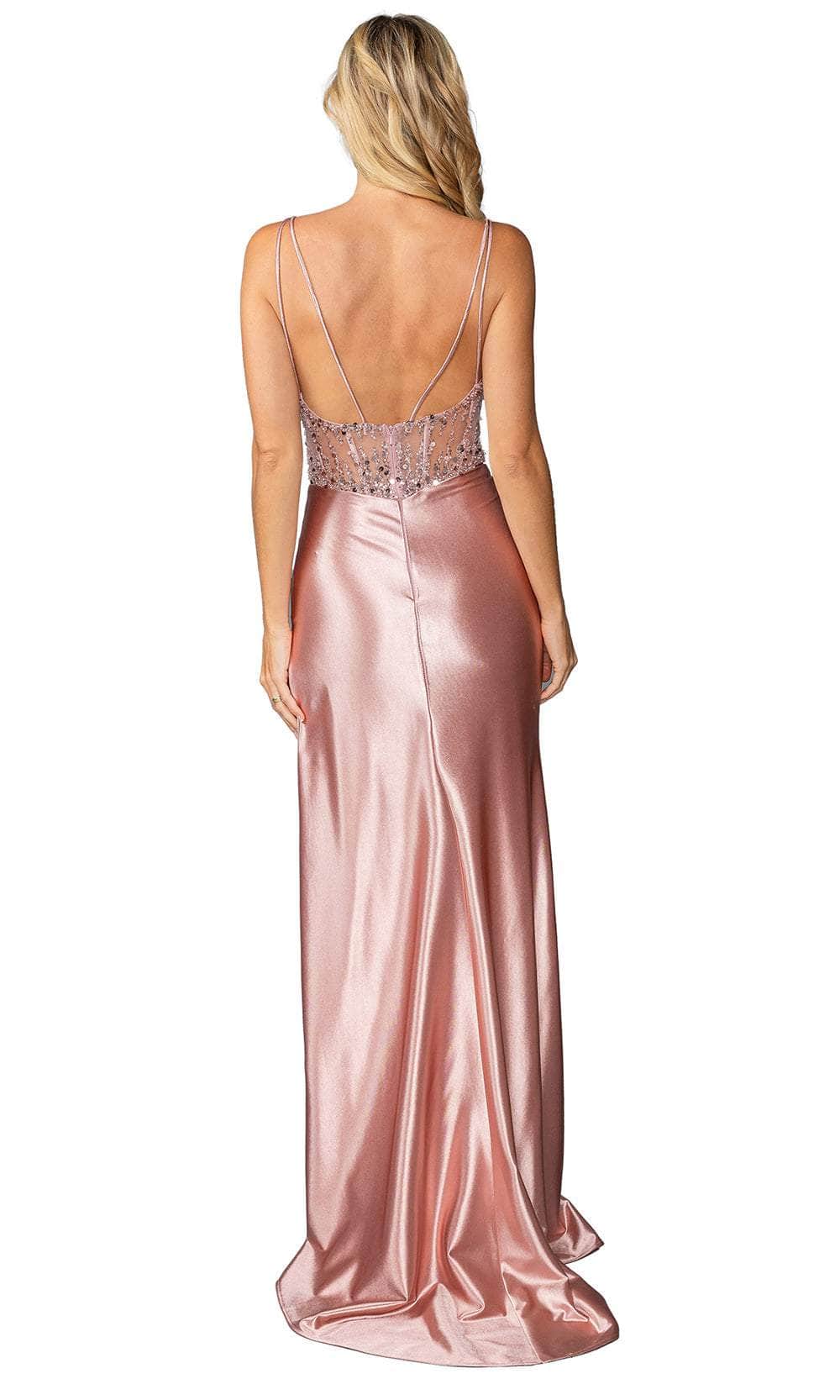 Elevate your presence with the enchanting Dancing Queen 4432 creation, a sartorial symphony of sophistication and allure. Impeccably tailored lines delicately contour the feminine form, embracing the wearer in a vision of grace. The gown features delicate spaghetti straps and a beguiling sweetheart neckline, while the sheer exposed boning bodice is adorned with sequins, lending a touch of celestial glamour. The embellished sheer strappy back adds an extra layer of intrigue, leading to a concealed zipper closure for seamless elegance. The sheath skirt cascades with artful draping, culminating in a high slit and a sweeping train. Inspire adoration in this alluring Dancing Queen 4432 masterpiece. Models are wearing the Fuchsia, Hunter Green, Rose Gold and Royal Blue colors.