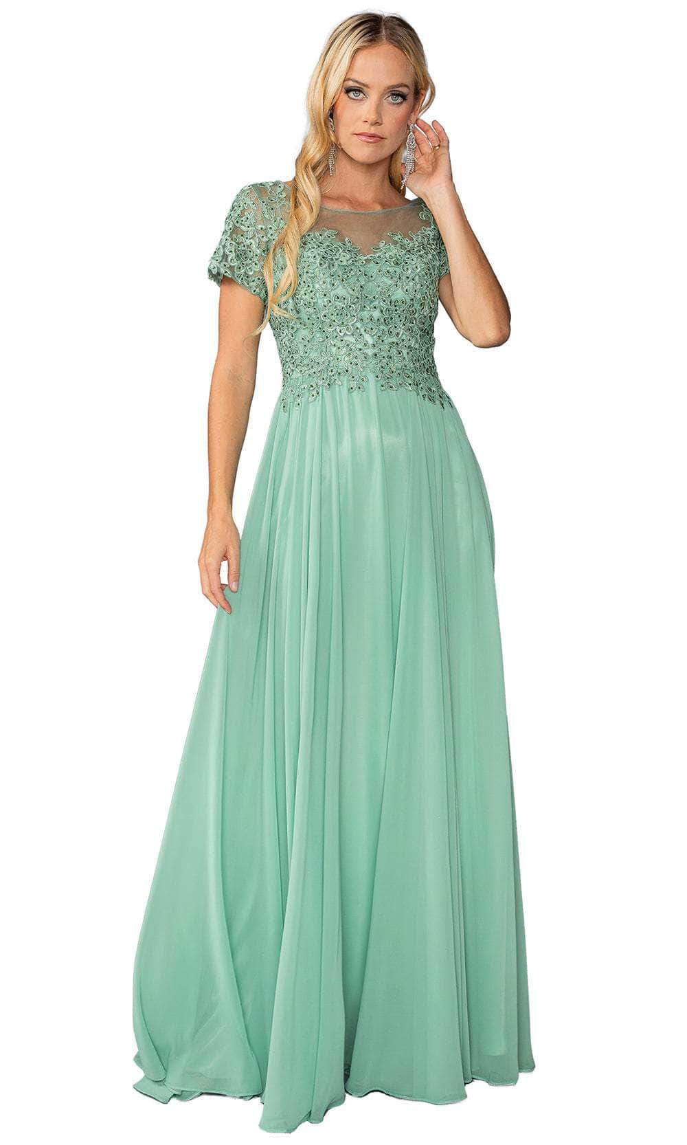 Turn yourself into a social butterfly in this exquisitely charming Dancing Queen 4433 gown. Impeccably adorned with tailoring lines, this bewitching creation celebrates the feminine form with its intricate design. The short sleeves gracefully complement the illusion bateau neckline, while rhinestones delicately accentuate lace appliques on the sheer bodice. A sheer full back, discreetly closed with a concealed zipper, adds an element of allure. The layered A-line skirt cascades into a floor-length hem, creating a vision of timeless elegance. Step into the spotlight and captivate onlookers in this sophisticated Dancing Queen 4433 masterpiece. Models are wearing the Champagne and Sage colors.