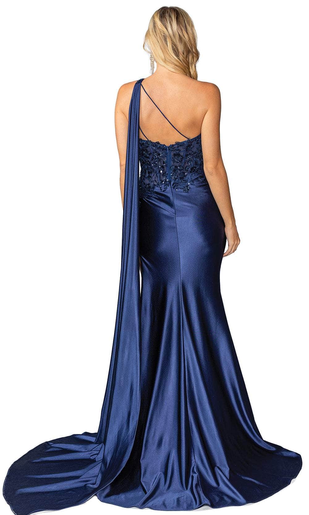 Be bound to attract attention in this Dancing Queen 4441 masterpiece. Embrace your unique style with its lace applique and shimmering beaded adornment on the illusion corset bodice. It flaunts a stunning one-shoulder design crowned by the asymmetrical neckline, and mid-open back. The long cape at the back adds a hint of drama and grandeur. Textured with soft ruching, the skirt sculpts a sheath silhouette that flawlessly skims to the sweep train. The thigh-high slit on the side reveals just the right amount of leg and flaunts your confidence. Elevate your Diva style in this Dancing Queen 4441 creation. Model is wearing Navy color.