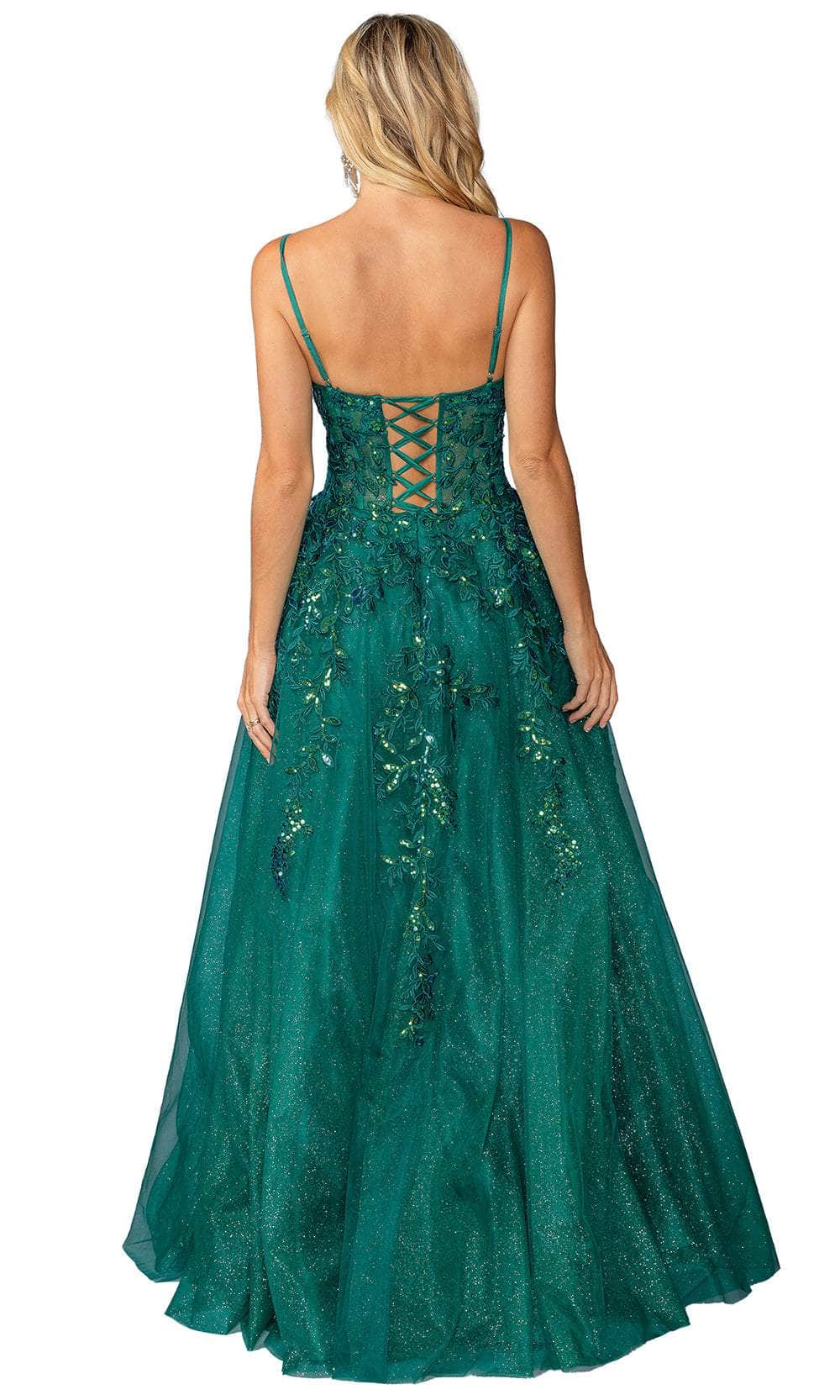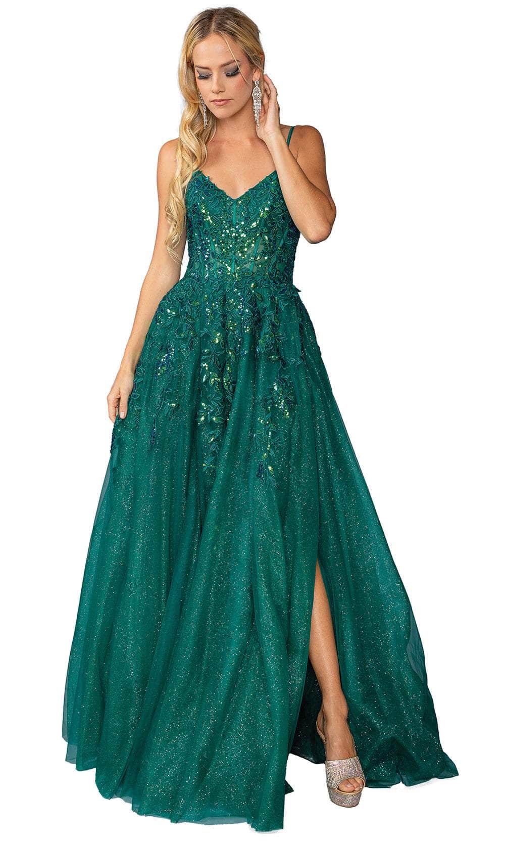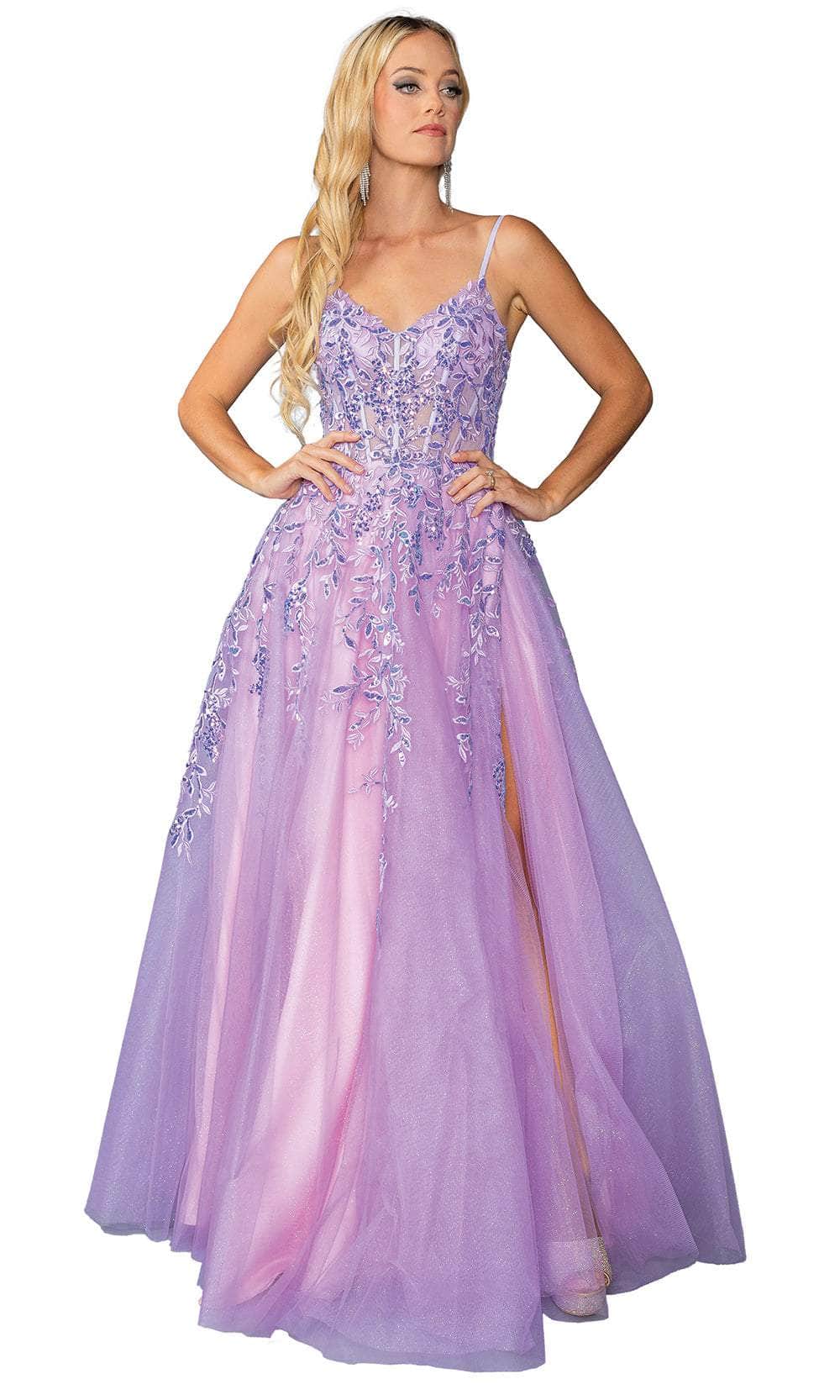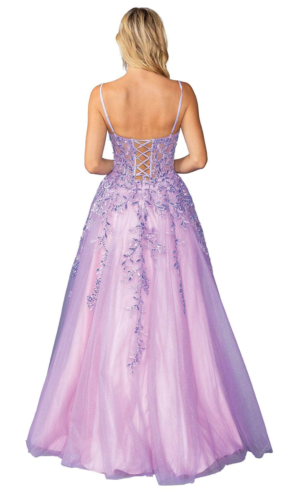 Blend elegance and sparkle with this Dancing Queen 4452. The sleeveless corset bodice, adorned with intricate embroideries, sparkling sequins, and glitters, frames a chic V-neckline. Delicate spaghetti straps provide graceful support, leading to a lace-up tie for a personalized fit. A secure center zipper closure at the back ensures ease of wear. The floor-length skirt parades in an A-line silhouette, accentuated by a daring high slit. This Dancing Queen 4452 is a perfect choice for those desiring a captivating blend of sophistication and glamour at any formal affair. Models are wearing Hunter Green and Lilac colors.