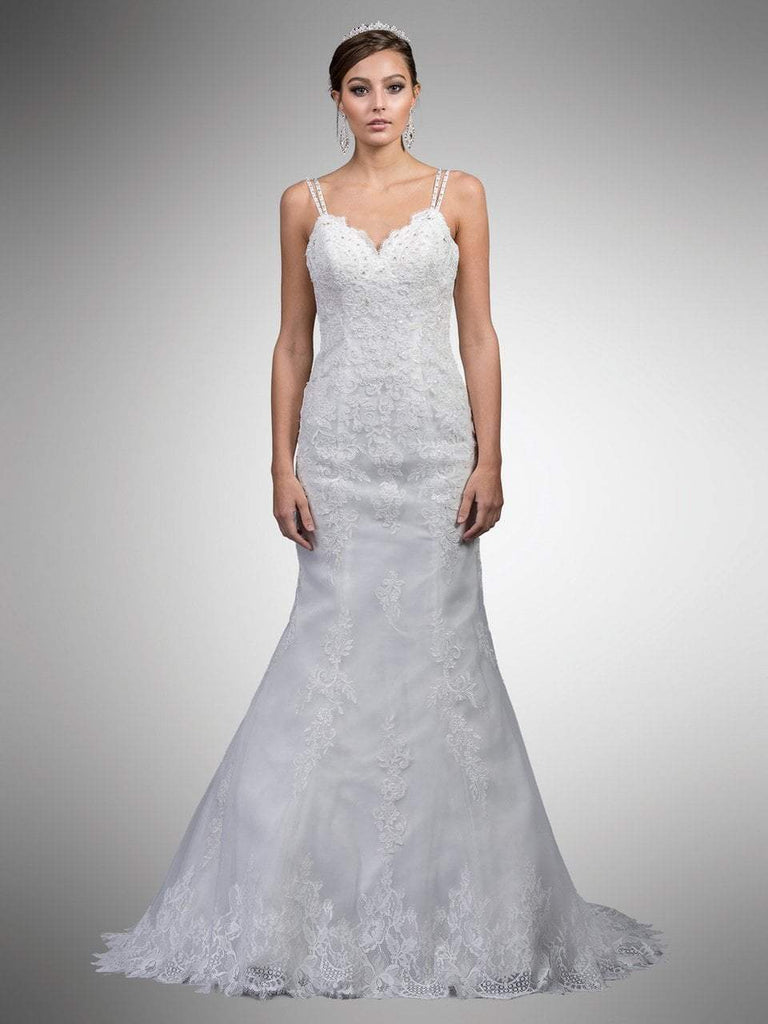 Exude a timeless appeal in this elegantly ornate gown by Dancing Queen 0005. This stunning piece has a sleeveless, sweetheart neckline with fitted bodice supported with dual straps. The bodice is embellished with beaded lace and flaunts a low scoop back with buttons. The skirt has pronounced mermaid silhouette and finishes the look in a dramatic sweep train. Dancing Queen gives you an intricate look that will last a lifetime.