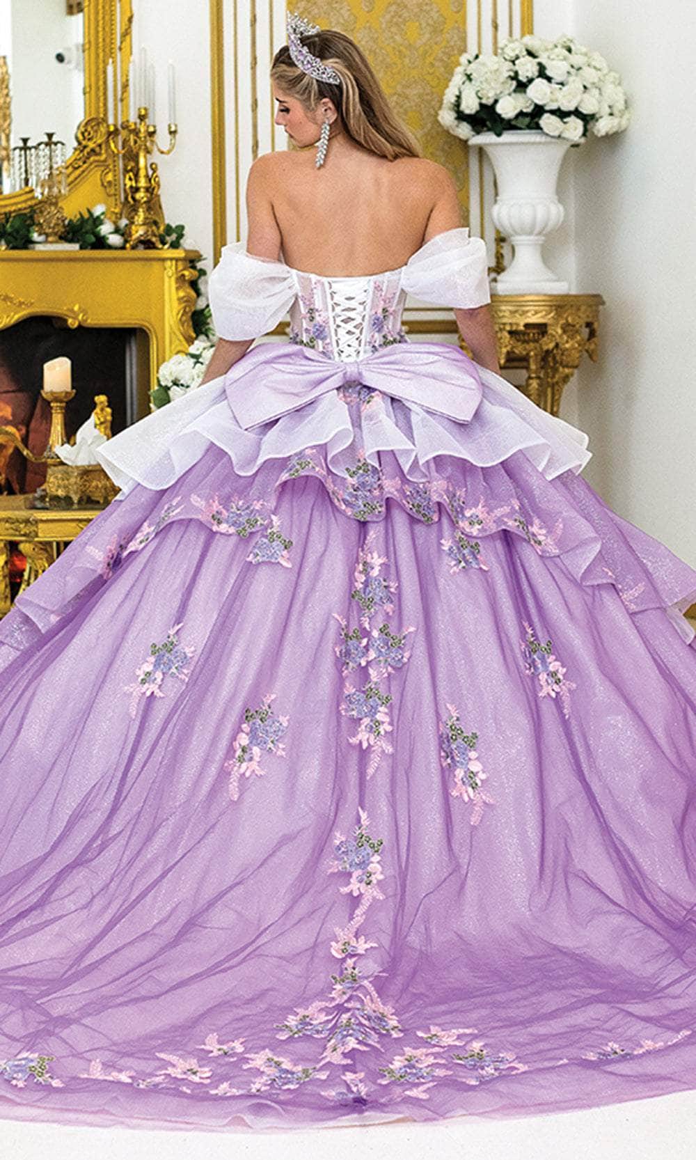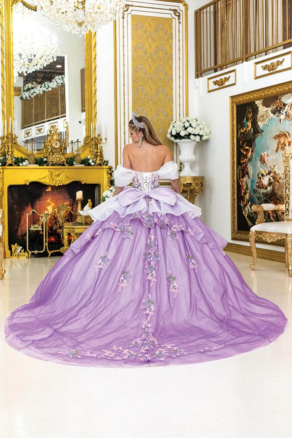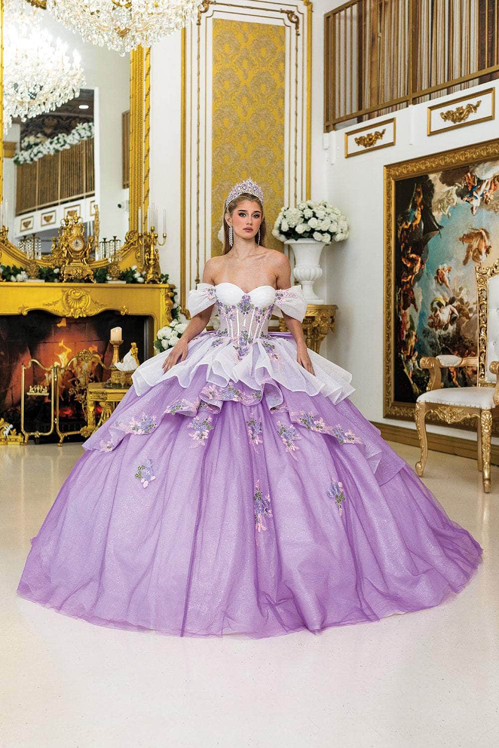 The Dancing Queen 5013 is a bold and dramatic gown that brings your royal dreams to life. Featuring floral embroidery and a layered ruffled overskirt, this ballgown makes a grand statement. The illusion corset bodice is designed with visible boning and pairs perfectly with off-shoulder puff sleeves. The Basque waistline cascades into a full skirt, adding dimension and flair. The Dancing Queen 5013 is ideal for quinceaneras or any event where you want to make a lasting impression. Model is wearing Off White/Lilac color.