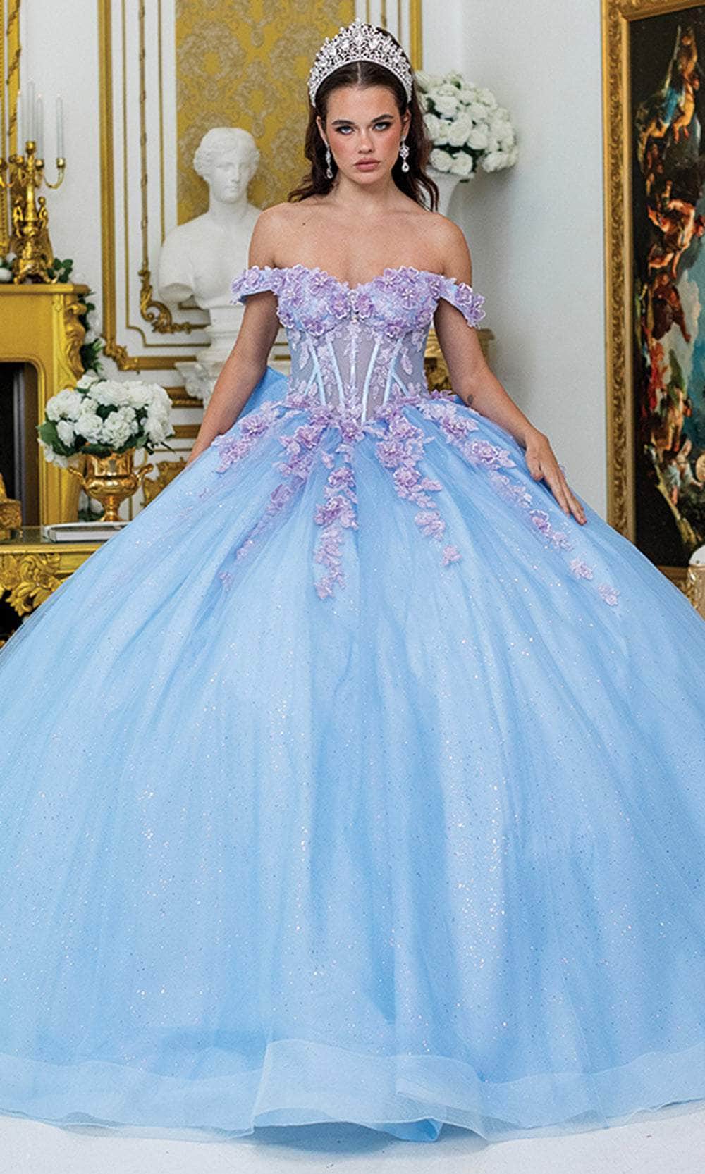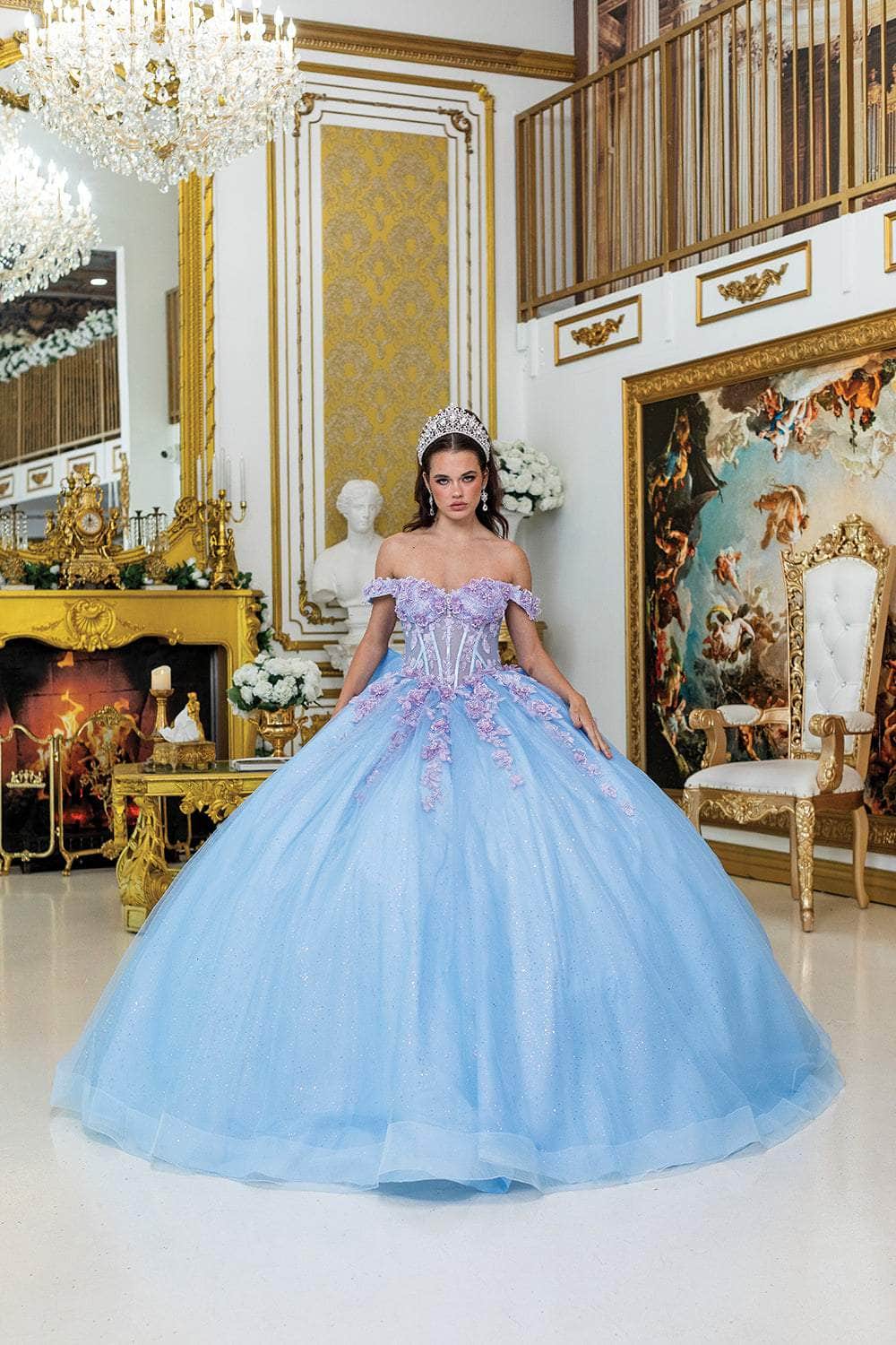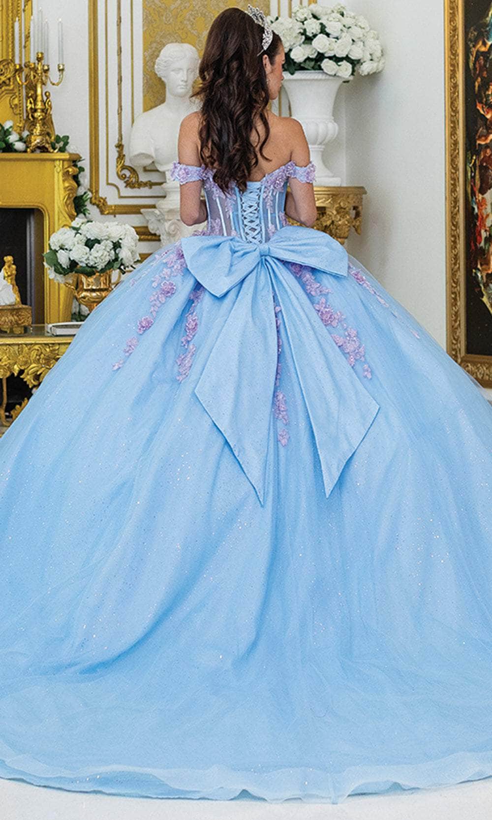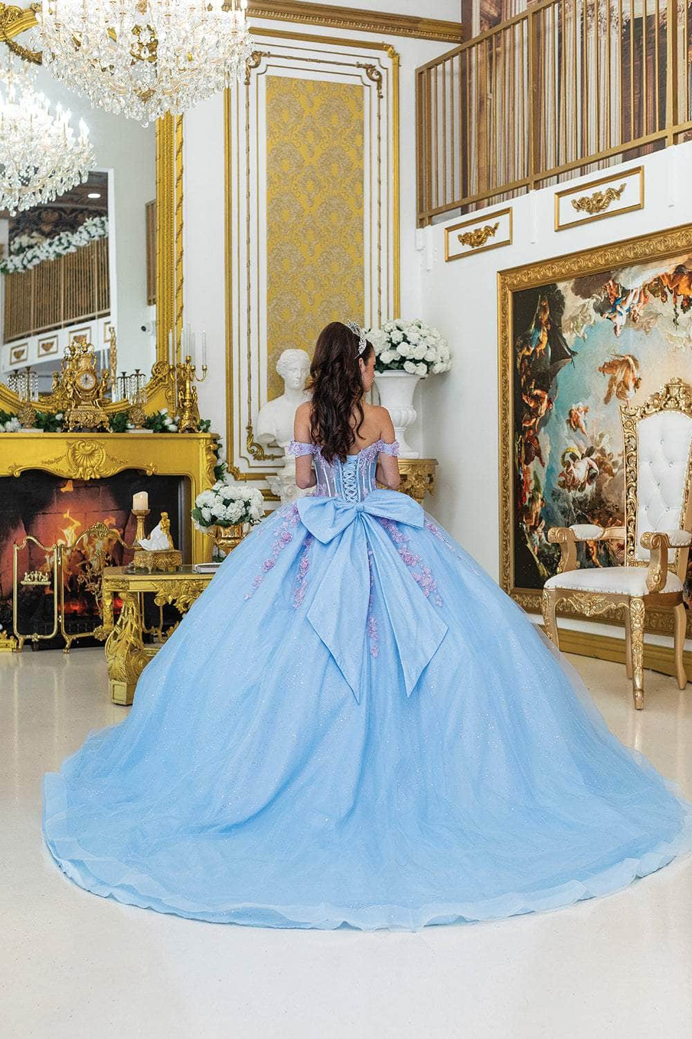 Create an unforgettable memory with the Dancing Queen 5016 gown, where sophistication meets grandeur. Glittering beads and intricate floral embroidery gracefully embellish the bodice and skirt, making this ballgown truly enchanting. The sweetheart off-shoulder neckline enhances its regal charm, while the oversized bow and lace-up closure create a stunning focal point at the back. With every movement, this gown radiates elegance and a storybook-like beauty. The Dancing Queen 5016 is the perfect choice for a girl who dreams of looking like royalty on her big night. Model is wearing Bahama/Lilac color.