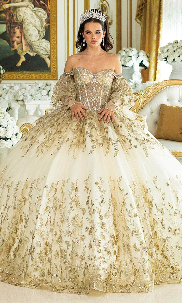 Celebrate in style with the opulent Dancing Queen 5019 ballgown, an embodiment of sophistication and glamour. The off-shoulder sweetheart neckline and long puff sleeves, paired with corset boning highlights your silhouette. The gown boasts luxurious metallic leaf embroidery and beaded embellishments over layers of shimmering fabric. A cascading ruffle-tiered design at the back enhances the grandeur of this voluminous ballgown. The Dancing Queen 5019 is ideal for any grand occasion, ensuring a majestic presence as you make cherished memories on your special day. Models are wearing Champagne, and Rose Gold colors.