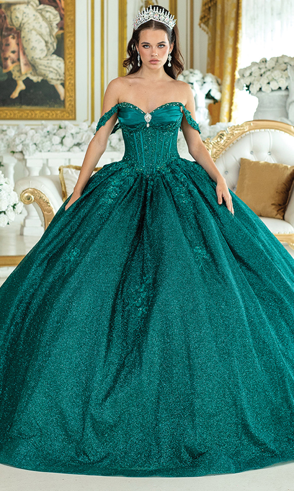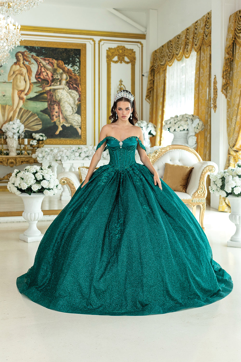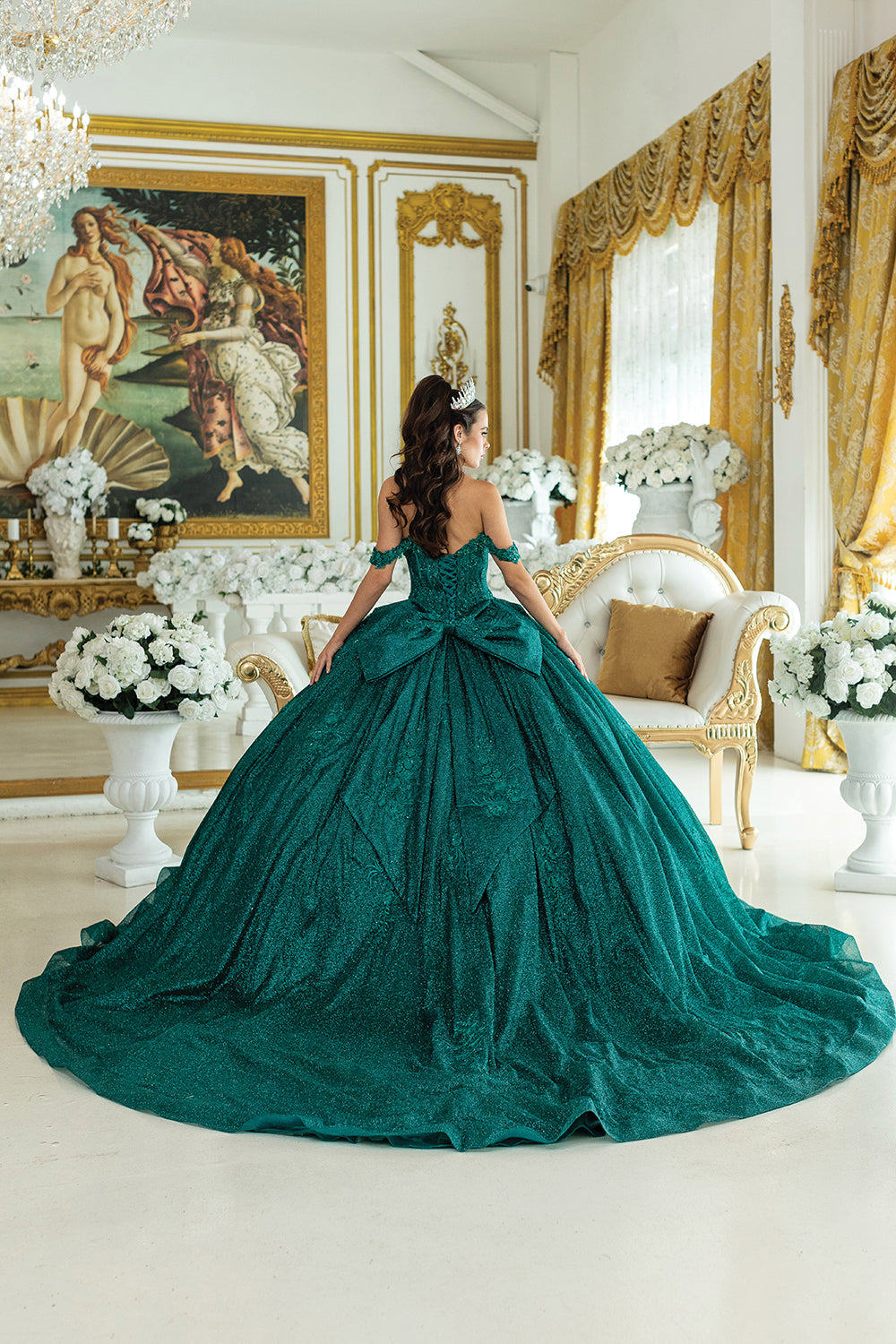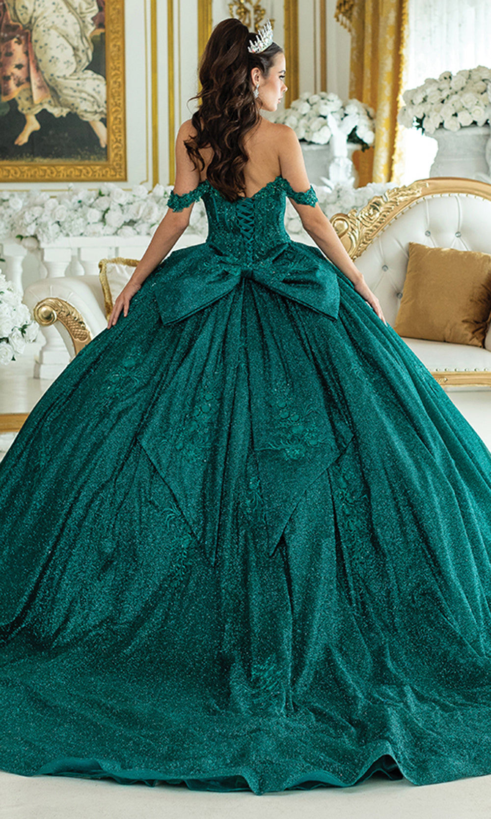 Graceful allure surrounds Dancing Queen 5035, a Quinceanera gown designed for unforgettable celebrations. Off-shoulder drape sleeves frame the pleated bustier and corset-structured bodice, detailed with visible boning, beadwork, and embroidered accents. The glittering full ball gown skirt sparkles with floral appliques trailing beautifully like a bouquet, flowing into a sweep train for dramatic effect. A bow accent at the back waist pairs with the lace-up V-back closure, completing the enchanting silhouette. Perfect for Sweet 16 parties and milestone occasions, Dancing Queen 5035 radiates timeless elegance. Model is wearing Hunter Green color.