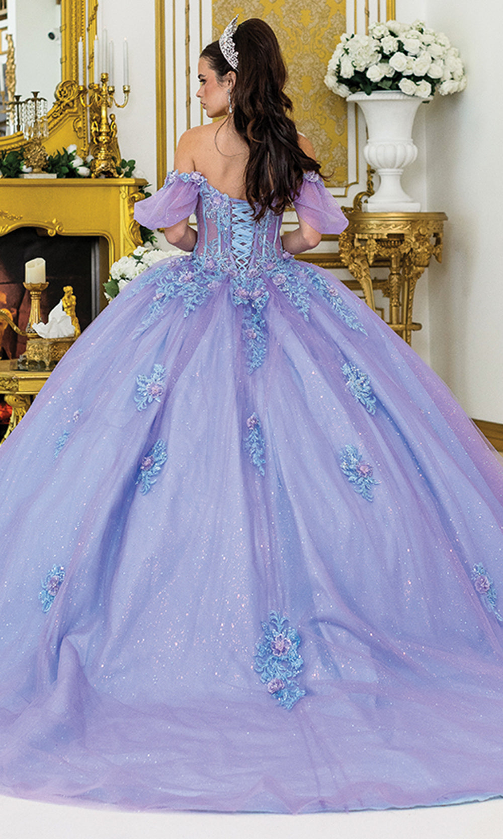 Romantic splendor shines through Dancing Queen 5039, a gown that captures the artistry of a fairytale celebration. The corset bodice with sheer panels and visible boning is adorned with 3D floral appliques, while off-shoulder puff sleeves add regal charm. A glittering tulle ball gown skirt sparkles with embroidery and appliques trailing gracefully like a bouquet, cascading into a majestic sweep train. The mid-open lace-up back completes the refined silhouette. Ideal for Quinceanera, Sweet 16 events, and milestone occasions, Dancing Queen 5039 ensures every entrance feels unforgettable. Model is wearing Lilac/Bahama/Blue color.