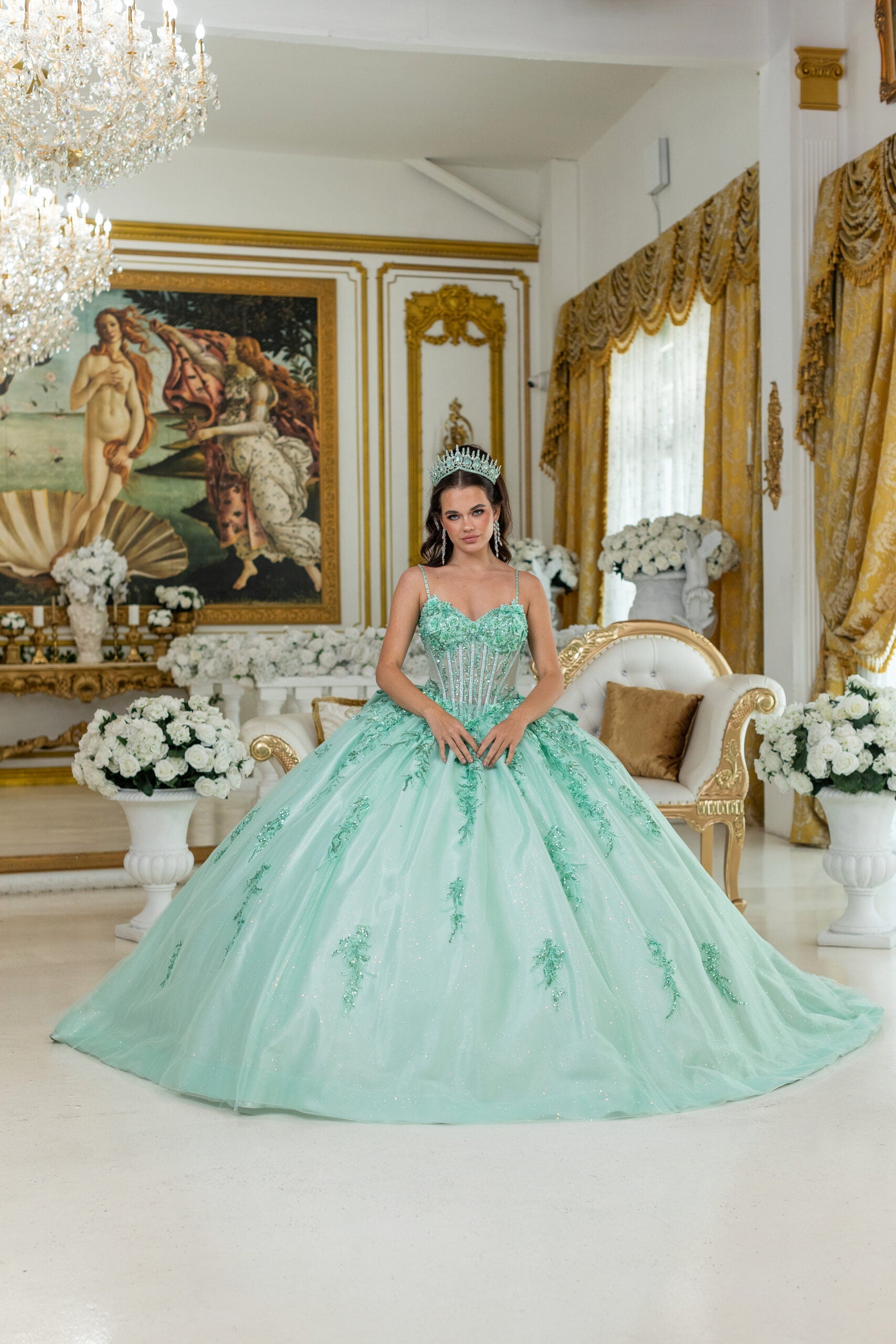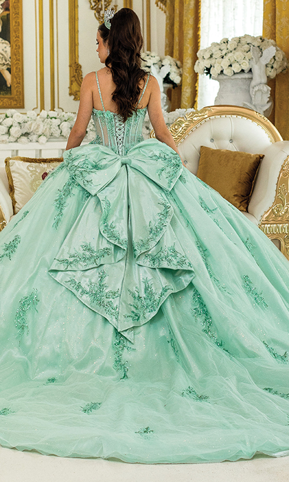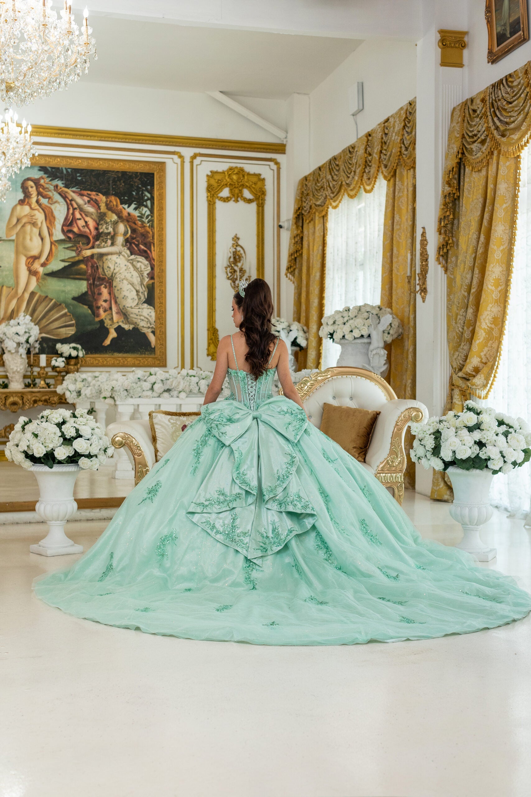 Dreamlike splendor begins with Dancing Queen 5049, a Quinceanera gown for the modern princess. The corset bodice with molded bustier and visible boning is richly beaded, framed by embellished thin shoulder straps. Floral embroidery adorns both the bodice and the full tulle ball gown skirt, cascading into a regal sweep train. At the back, a structured bow accent enhances the lace-up mid-open design, and dreamlike splendor lingers with Dancing Queen 5049, ensuring every milestone celebration feels like a royal dream. Model is wearing Mint color.