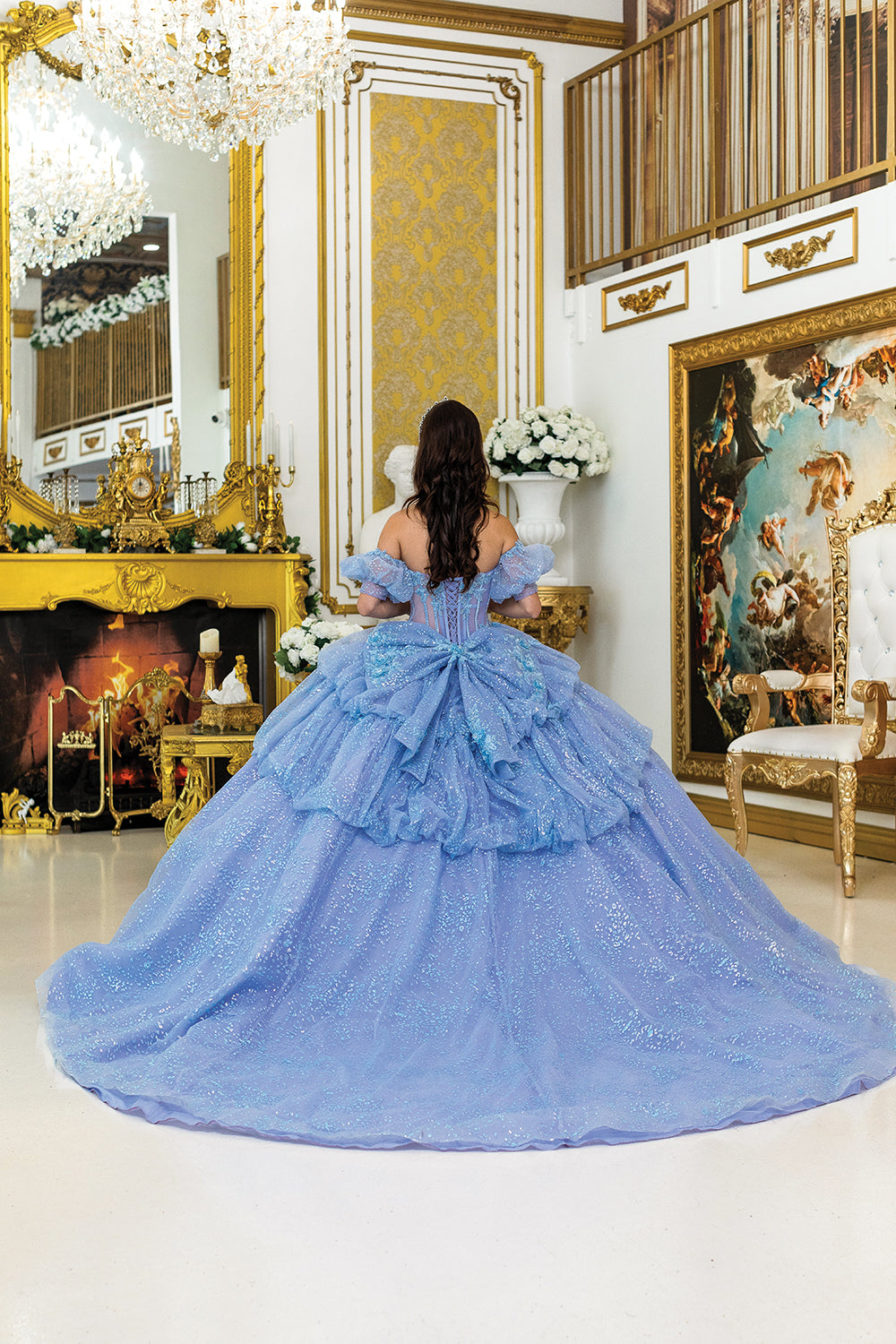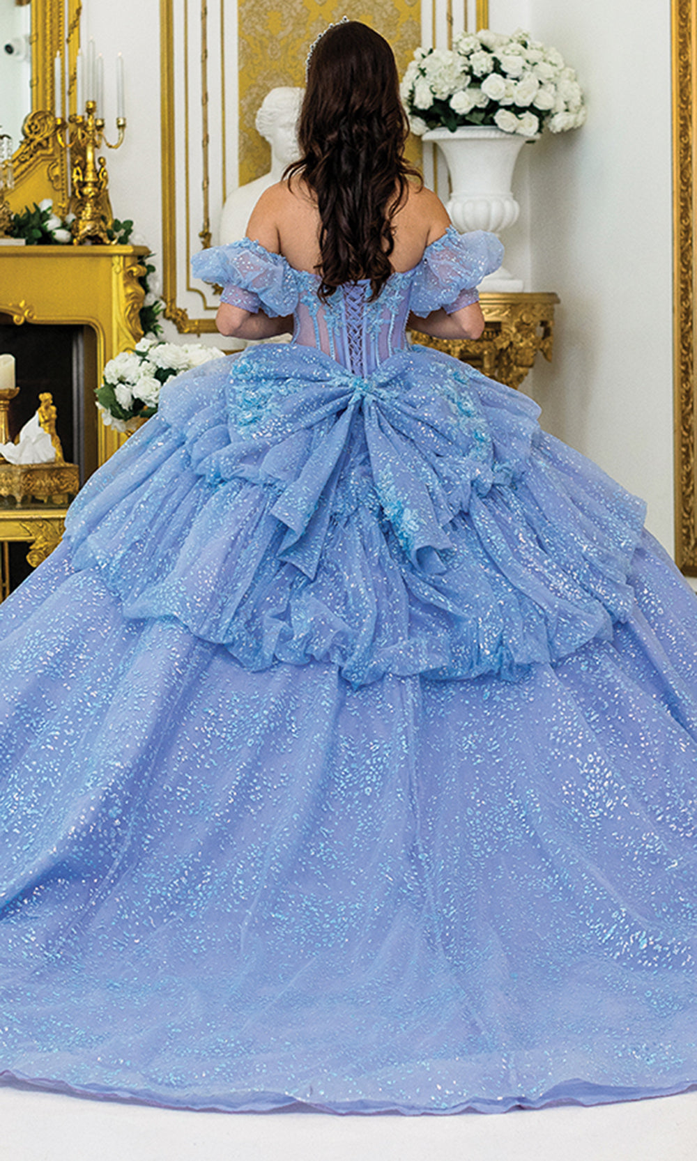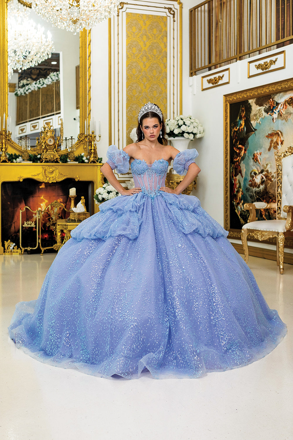 Royal brilliance defines Dancing Queen 5050, a gown that transforms celebrations into timeless memories. The glitter corset bodice with molded bust and visible boning is adorned with delicate floral embroidery and appliqué details, paired with detachable off-shoulder puffy sleeves. A voluminous ball gown skirt is layered with a puffy peplum, flowing into a regal sweep train. At the back, a bow accent enhances the lace-up mid-open closure, and fairytale elegance lingers with Dancing Queen 5050, ensuring every celebration feels like a royal dream. Model is wearing Bahama Blue/ Lilac color.