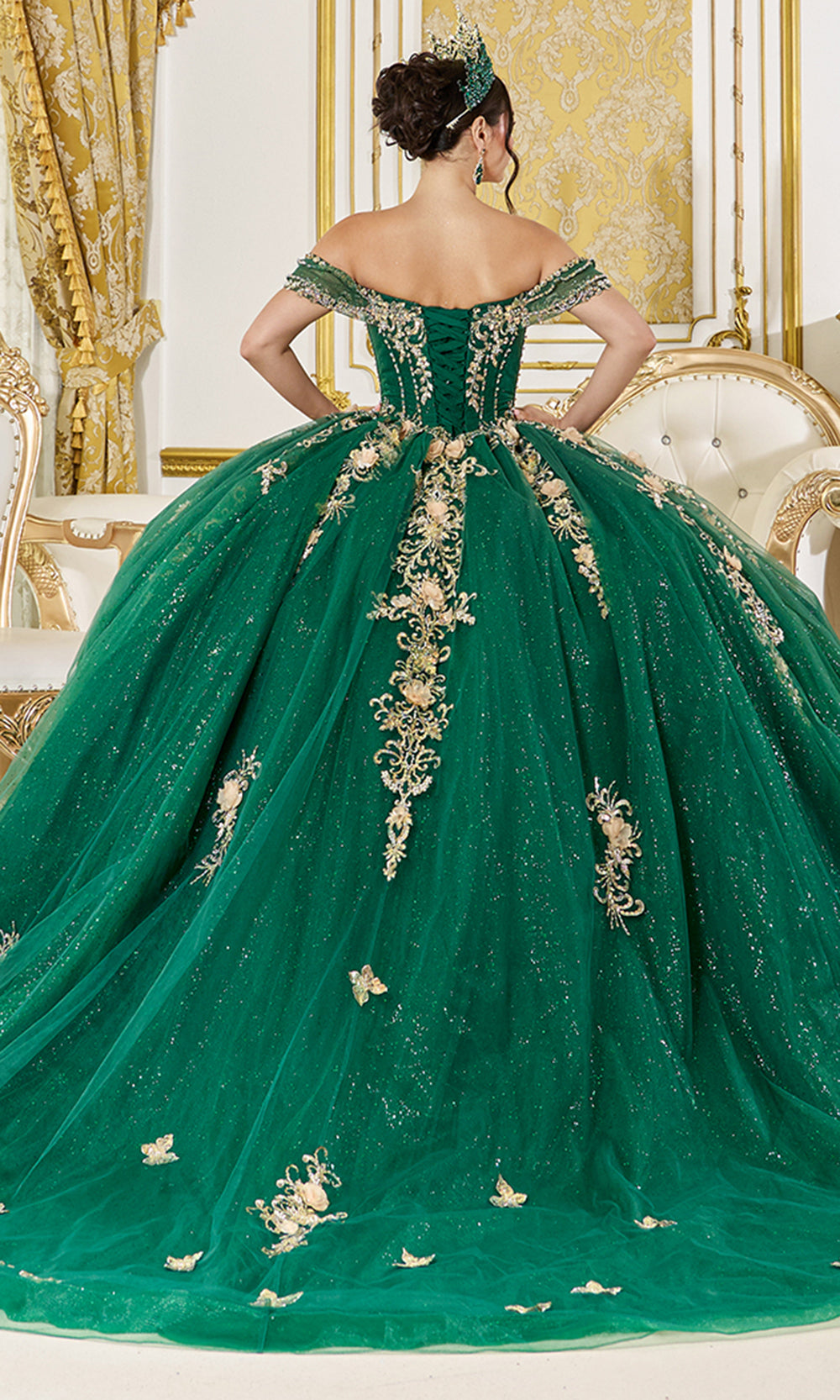 Majestic splendor surrounds Dancing Queen 5060, a gown crafted for unforgettable celebrations. The corset bodice with molded bust and visible boning dazzles with gilded metallic lace embroidery and appliques, styled in an off the shoulder design. A glitter tulle ball gown skirt shines with layered grandeur, cascading into a sweep train. Finished with a lace up mid open back, majestic splendor endures with Dancing Queen 5060, ensuring every Quinceanera or Sweet 16 feels like a royal dream. Model is wearing Hunter Green color.