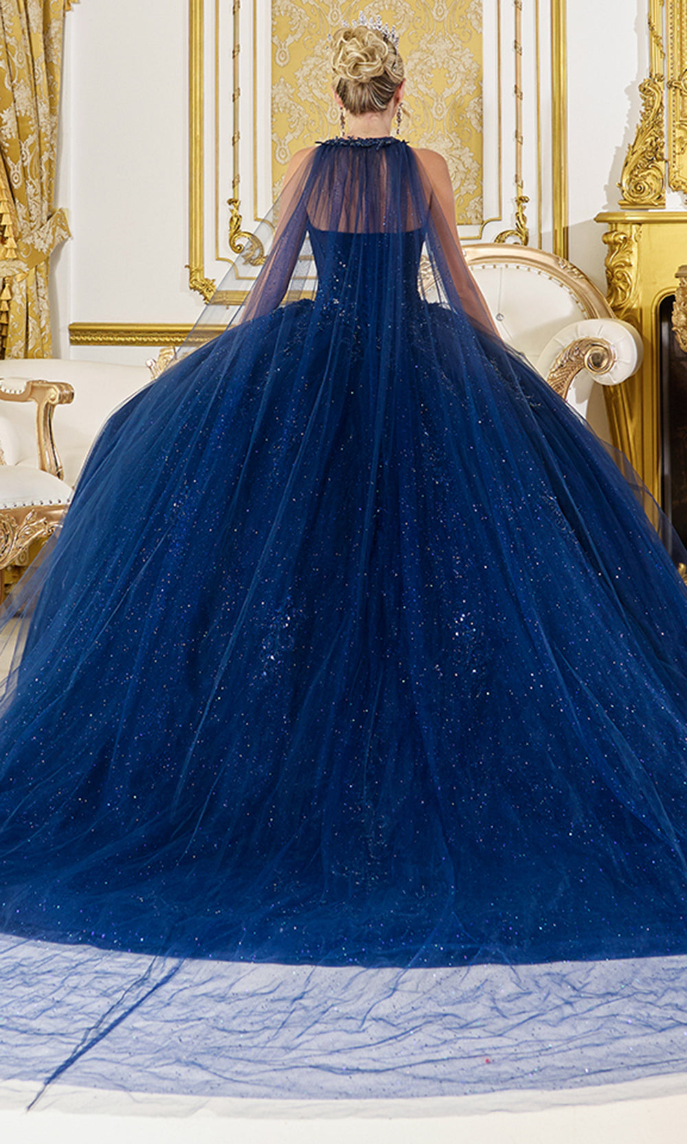 Royal enchantment begins with Dancing Queen 5061, a Quinceanera gown for the modern princess. The corset bodice with molded bustier and visible boning glimmers with beaded lace appliques, styled with embellished halter straps. A sheer cape drapes elegantly from the back of the halter, adding ethereal movement. The glitter tulle ball gown skirt enchants with layered volume, finished with a horsehair hem and regal sweep train. Royal enchantment lingers with Dancing Queen 5061, ensuring every celebration feels like a fairytale dream. Model is wearing Navy color.