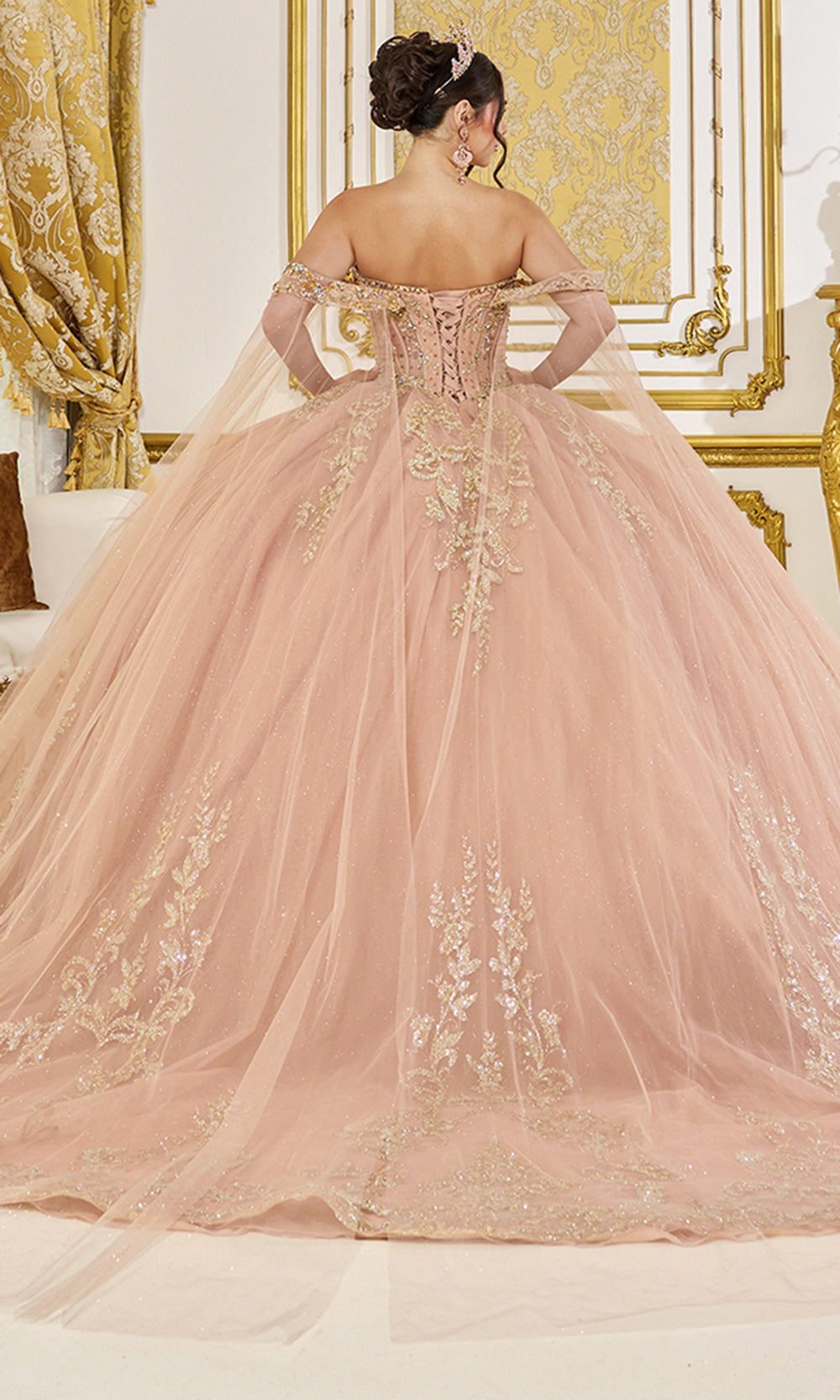 A symphony of elegance begins with Dancing Queen 5069, a gown composed for royal celebrations. The sheer corset bodice with molded bustier and visible boning sparkles with embroidered metallic appliques, styled with a ruched sweetheart neckline. Sheer cape sleeves frame the silhouette, while a tiered peplum overlay enhances the glitter tulle ball gown skirt, adorned with matching embroidery and flowing into a majestic sweep train. Completed with a lace up mid open back, celestial elegance endures with Dancing Queen 5069, ensuring every Quinceanera or Sweet 16 feels like a royal dream. Model is wearing Rose Gold color.