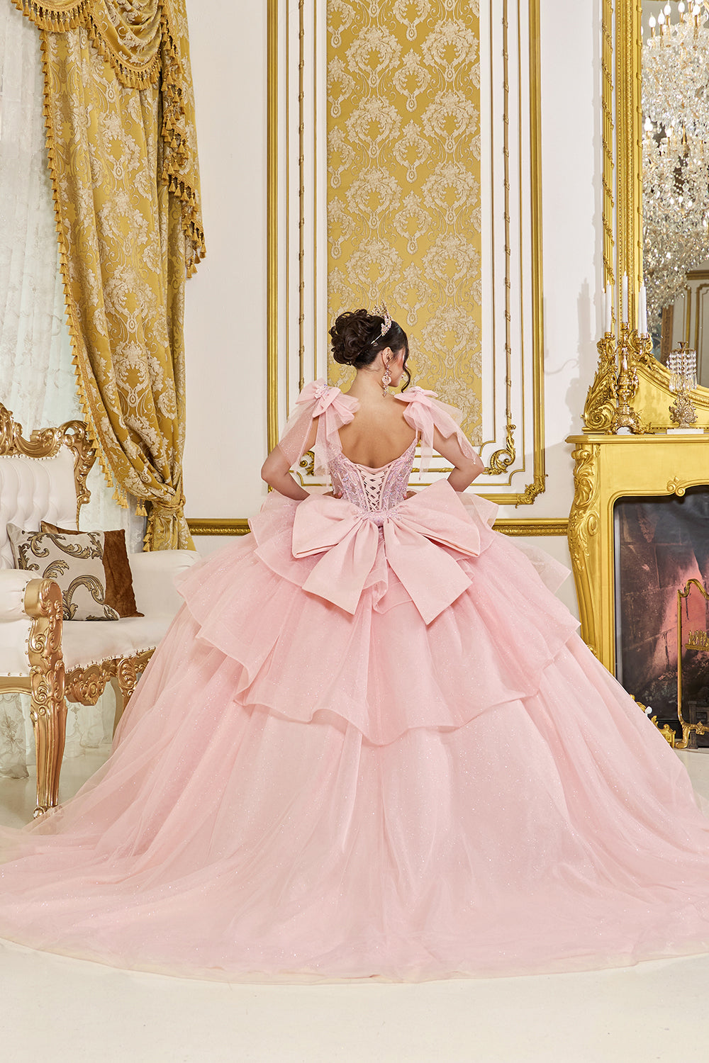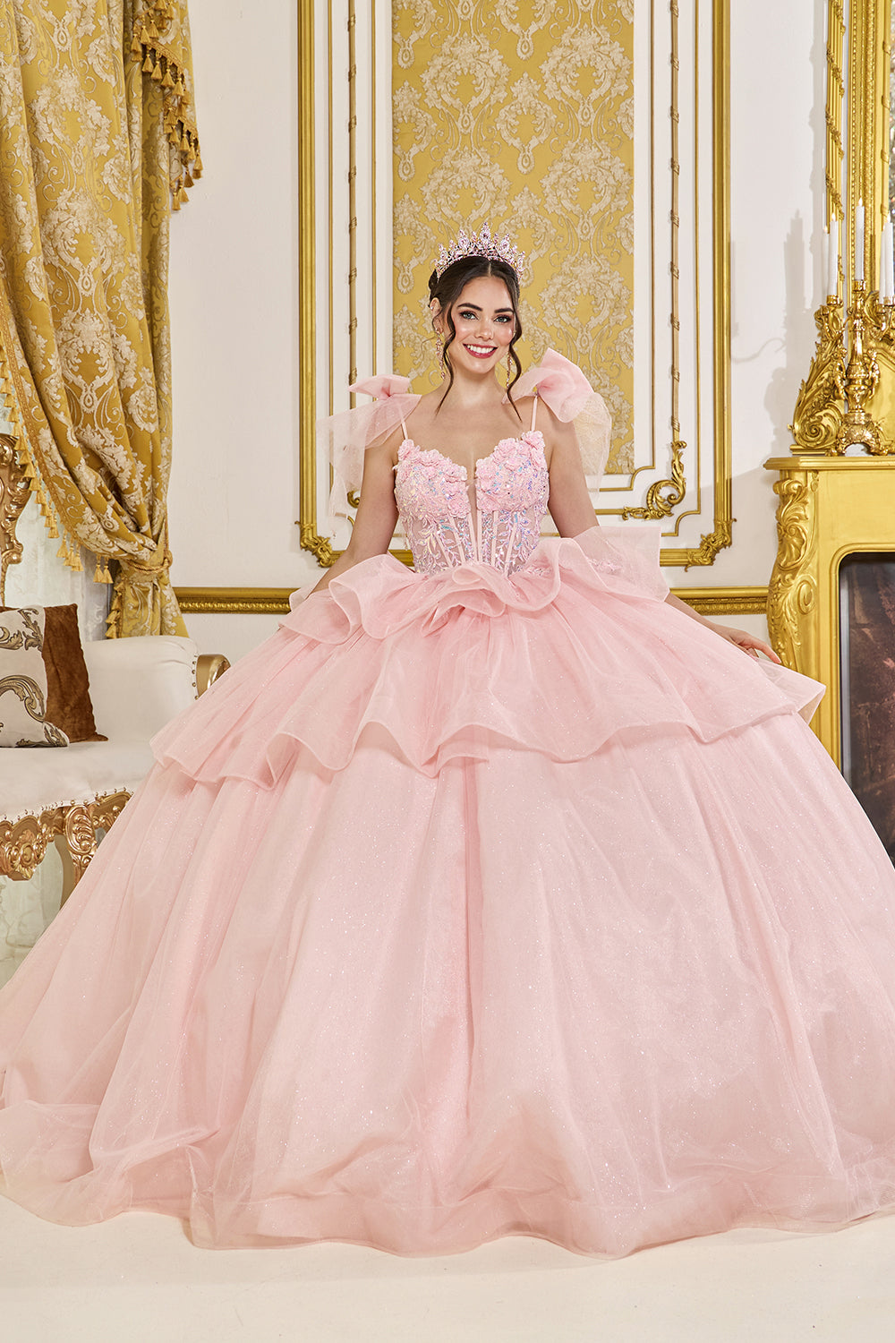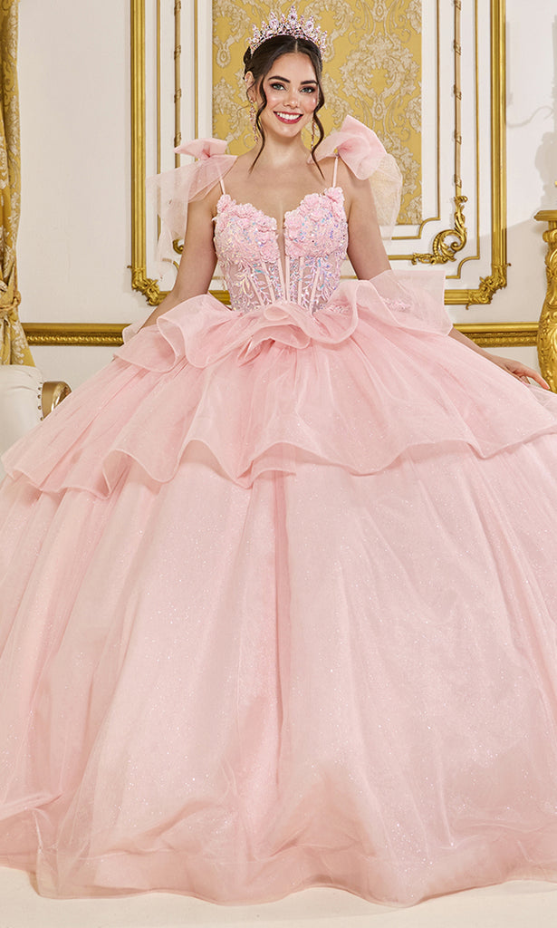 Graceful charm radiates from Dancing Queen 5079, a Quinceanera gown for the modern princess. The sleeveless corset bodice with sheer panel, molded bustier, and visible boning sparkles with beaded floral appliques, styled with thin shoulder straps adorned by bow accents. A layered tulle ball gown skirt cascades in ruffled tiers, embellished with matching appliques and flowing into a sweep train. The lace up back is followed by a structured bow accent at the waist. Radiant allure lingers with Dancing Queen 5079, ensuring every celebration feels magical. Model is wearing Blush color.