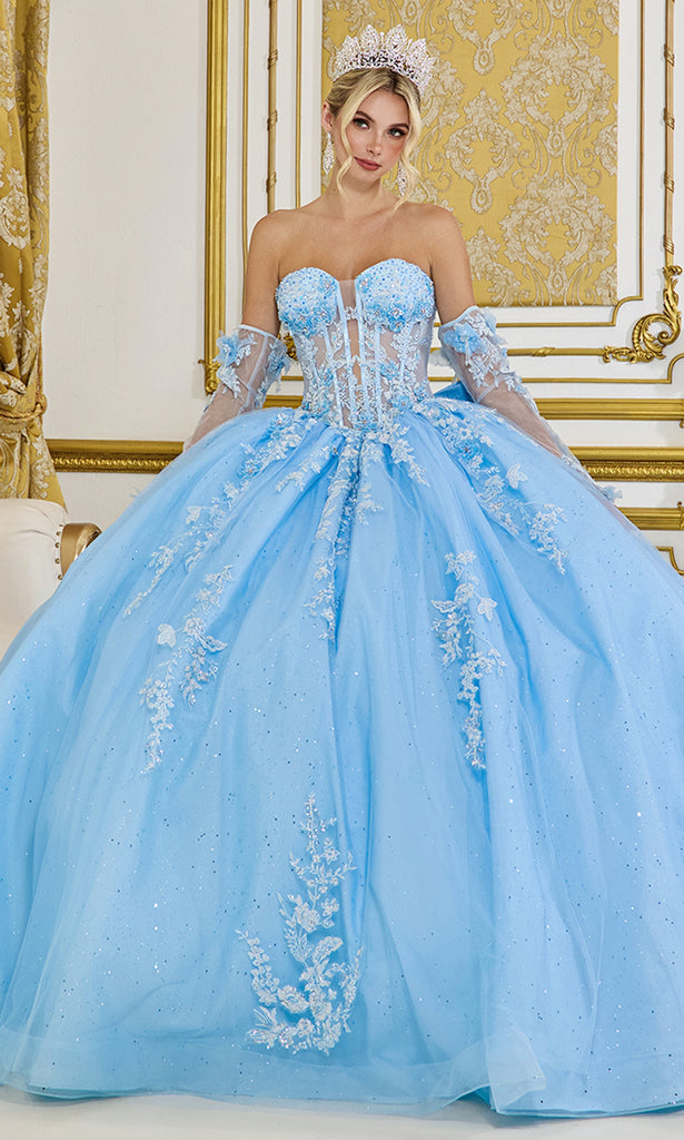 Blooming elegance begins with Dancing Queen 5081, a Quinceanera gown for the modern princess. The sleeveless corset bodice with illusion sheer panel, molded bustier, and visible boning gleams with embroidered floral appliques and delicate beading. Optional detachable sheer off shoulder sleeves add romantic versatility. A glitter tulle ball gown skirt sparkles with matching floral embellishments, flowing into a regal sweep train. The lace up mid open back is followed by a structured bow accent at the waist. Timeless enchantment lingers with Dancing Queen 5081, ensuring every celebration feels magical. Model is wearing Bahama Blue color.