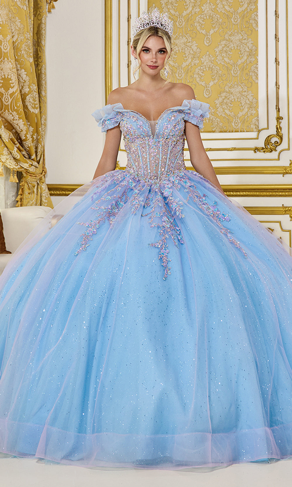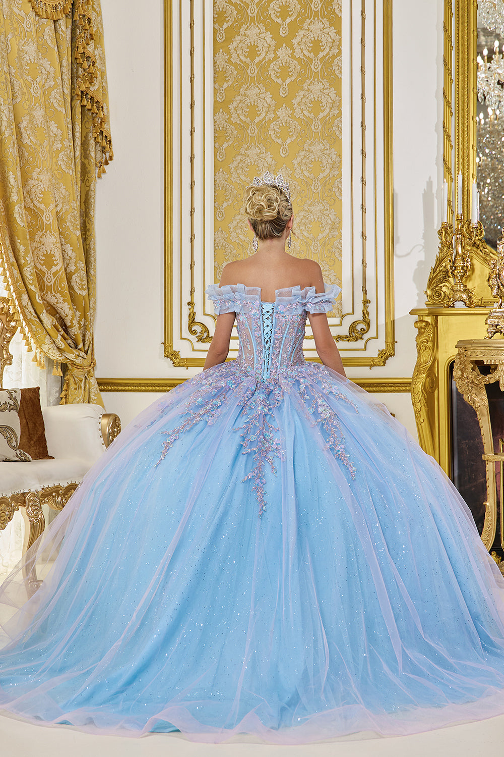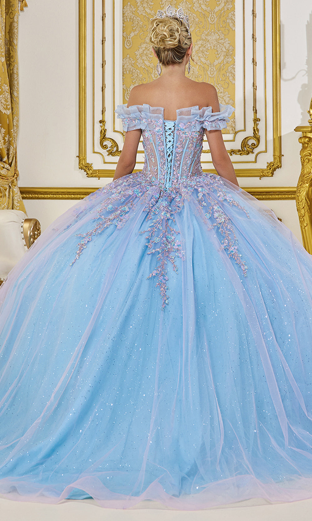 Radiant grace begins with Dancing Queen 5084, a Quinceanera gown for the modern princess. The off shoulder corset bodice with molded bustier and visible boning gleams with beaded lace appliques, styled with ruffled sleeves that frame the sweetheart neckline. Embroidery continues at the waist, flowing into a glitter tulle layered ball gown skirt. Finished with a horsehair hem, the silhouette extends into a regal sweep train. The lace up mid open back completes the look. Timeless splendor lingers with Dancing Queen 5084, ensuring every celebration feels magical. Model is wearing Lilac/Bahama/Blue color.