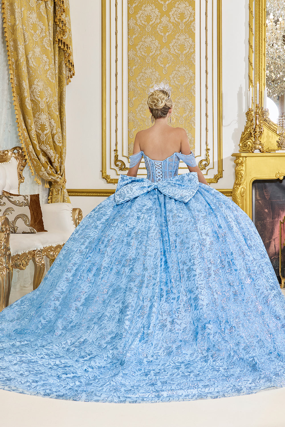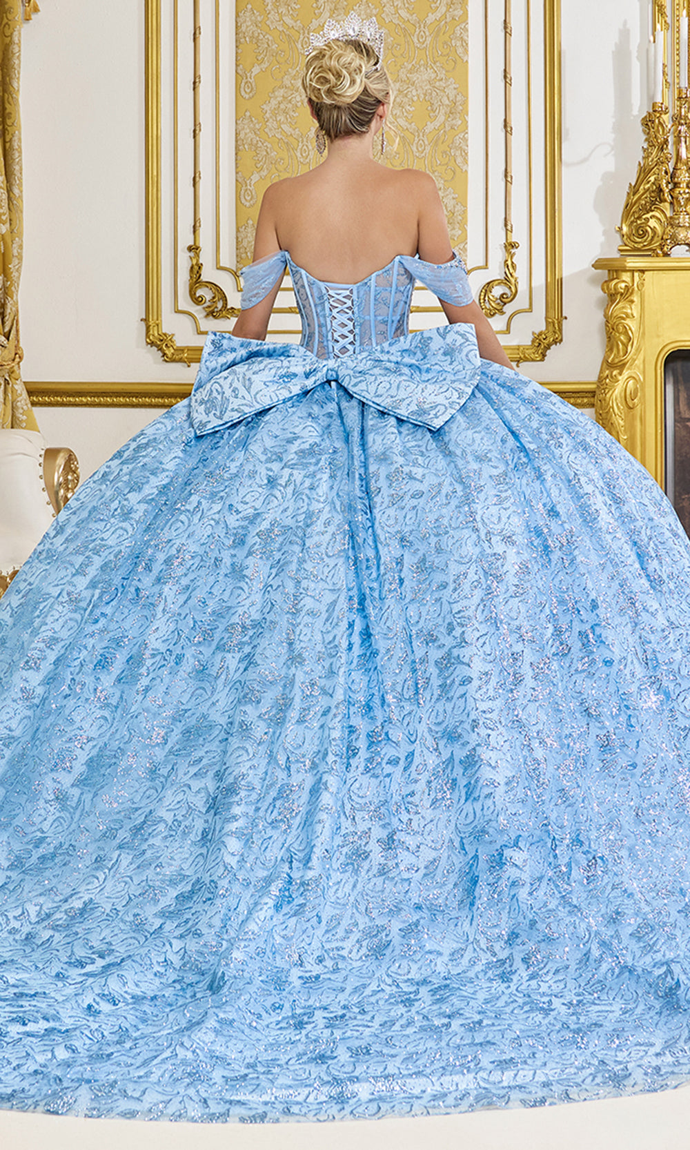 Dancing Queen 5095, a dress designed for spectacular events, exudes enchanted charm. Styled in an off-the-shoulder neckline with draped sleeves, the corset bodice with molded bustier, visible boning, and sheer illusion panel sparkles beneath a 3D floral lace overlay. A magnificent sweep train descends from a full ball gown skirt adorned with embroidered details. A bow accent at the waist completes the lace-up mid-open back. With Dancing Queen 5095, blooming elegance endures, making every Sweet 16 or Quinceanera feel enchanting. Model is wearing Bahama Blue color.