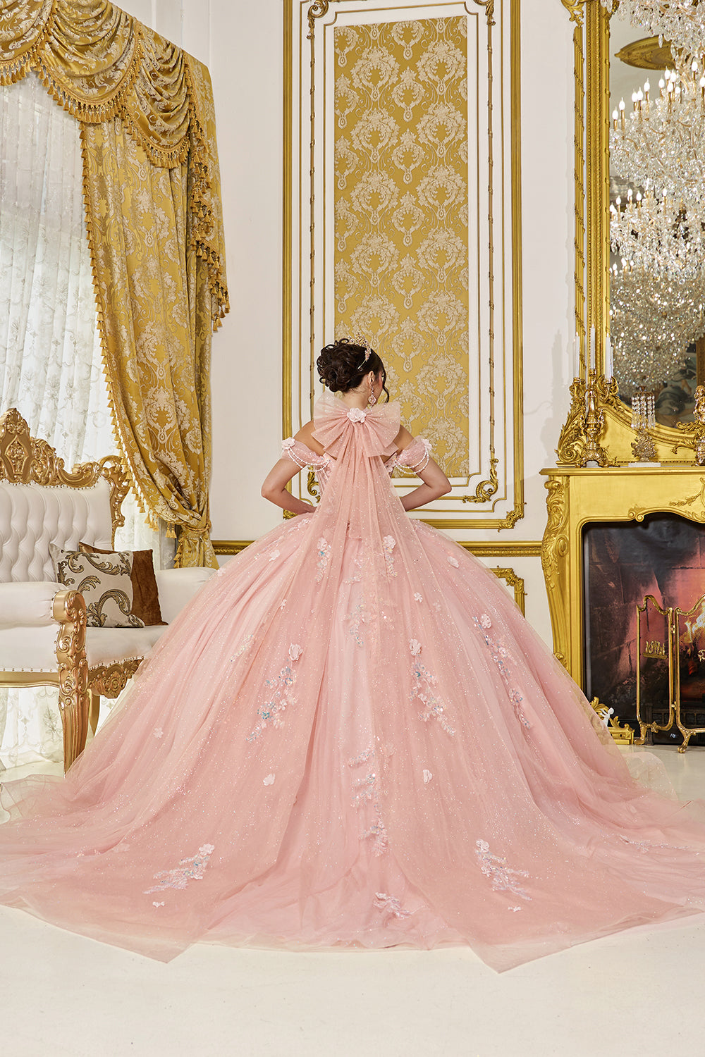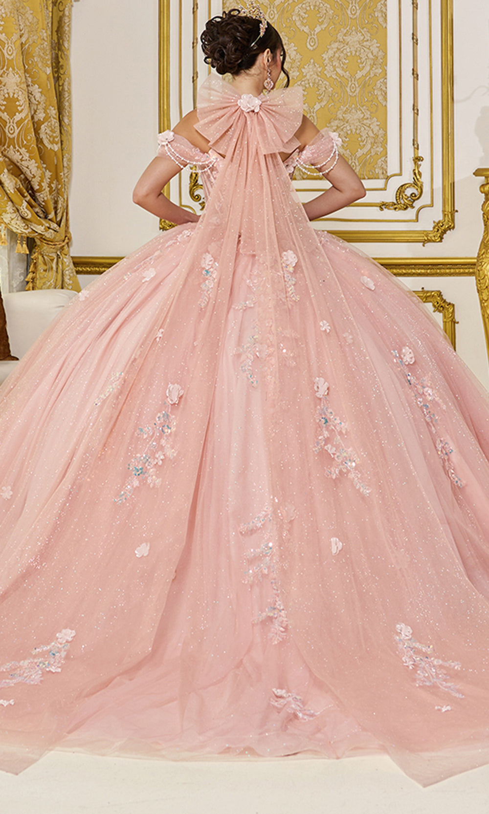 Radiant majesty begins with Dancing Queen 5096, a Quinceanera gown for the modern princess. The off shoulder sweetheart corset bodice with molded bustier and 3D floral lace overlay gleams with intricate beading. Draped sleeves add romantic charm, while floral appliqués cascade into a sparkling tulle ball gown skirt. Finished with a horsehair hem and flowing train, this gown embodies grandeur. Enchanted brilliance endures with Dancing Queen 5096, ensuring every celebration feels unforgettable. Model is wearing Blush color.