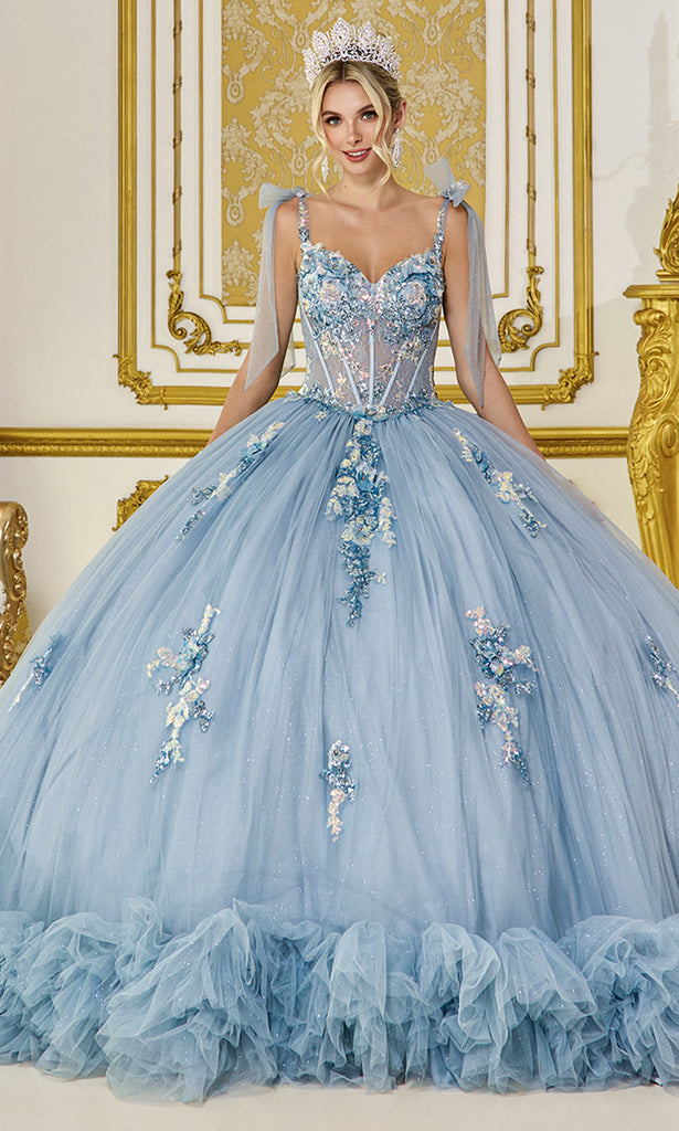 Radiant bloom begins with Dancing Queen 5104, a Quinceanera gown for the modern princess. The floral beaded corset bodice with molded bustier, visible boning, and sheer structure gleams with 3D appliqués adorning the bust. Embellished straps add delicate charm, while similar artistry flows into a glittering tulle ball gown skirt. A ruffled hem and sweeping train complete the silhouette. Timeless elegance endures with Dancing Queen 5104, a gown that leaves an unforgettable impression at every grand celebration. Model is wearing Dusty Blue color.
