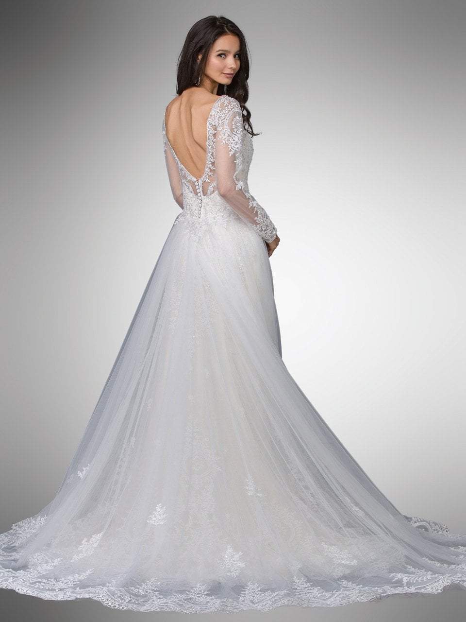 | Details: | Two tone, Sheer fabric, Long sleeves, Beaded lace, Fitted bodice, Sweetheart lining, A-line skirt, Low scoop back, Buttons, Sweep train |