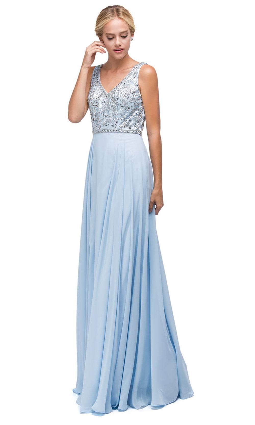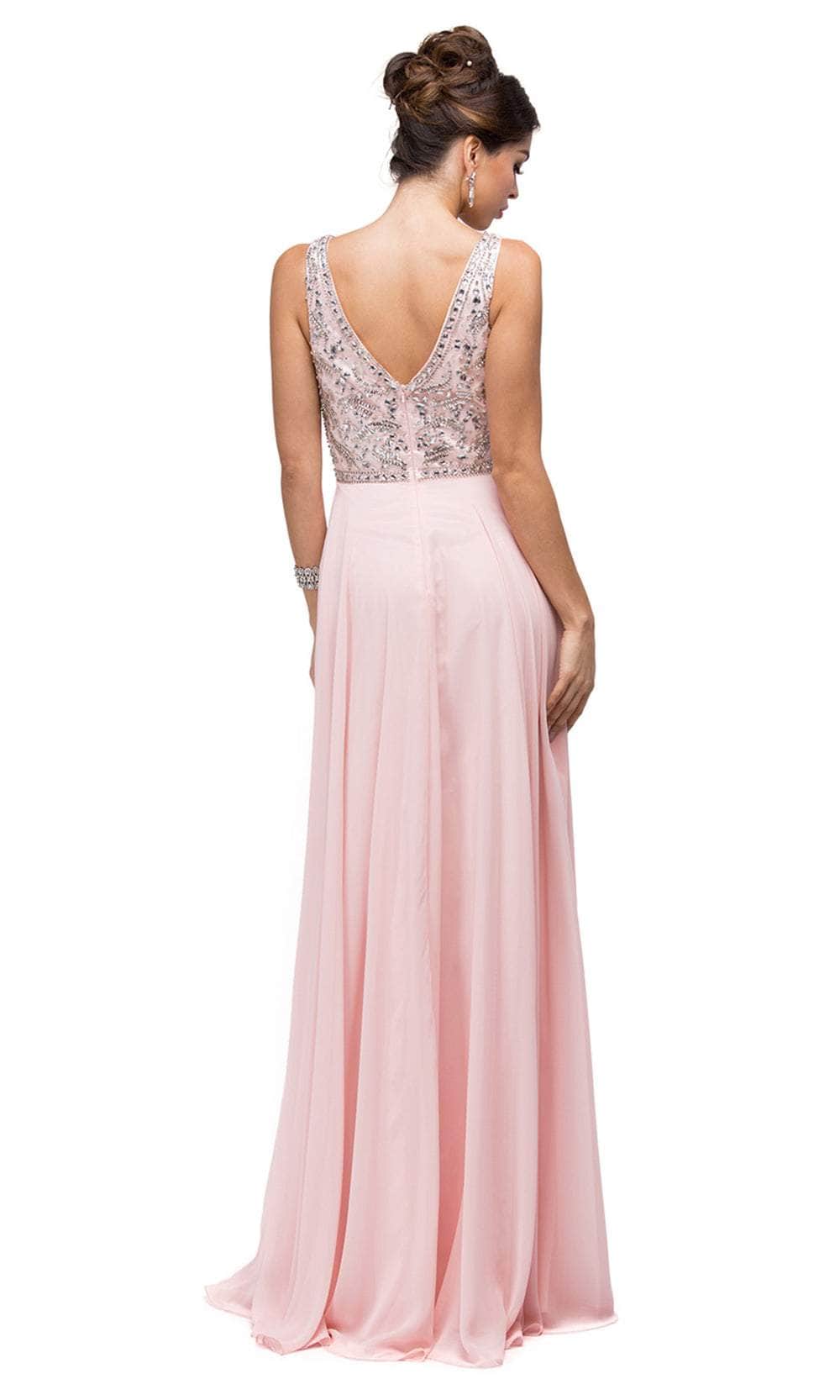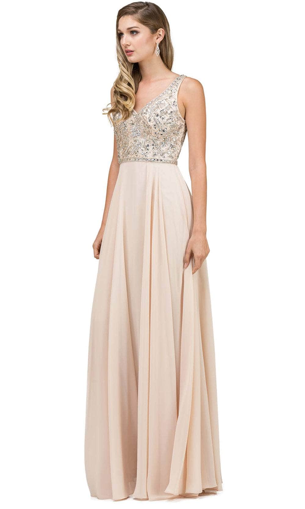 The Dancing Queen 9589 evening gown shimmers with a soft sheen, creating a breathtaking silhouette. Expert tailoring sculpts a flattering silhouette, highlighted by a plunging v-neckline and a sleeveless design that flatters your shoulders. The bodice shimmers with meticulously placed crystal details. A v-open back ensures both comfort and modern allure throughout the evening. The flowing chiffon skirt cascades to the floor in a graceful movement. This Dancing Queen 9589 masterpiece's intricate design shimmers like diamonds sprinkled under a starry night. Models are wearing the Aqua, Blush, Burgundy, and Champagne colors.
