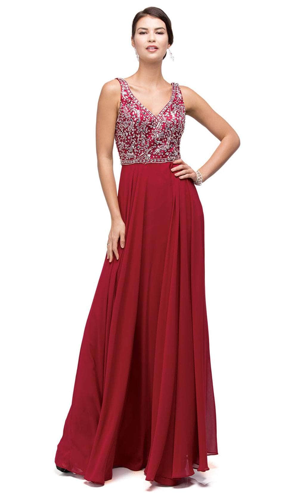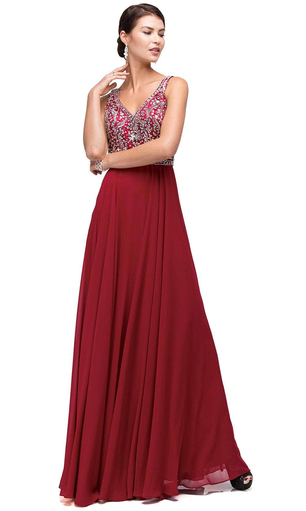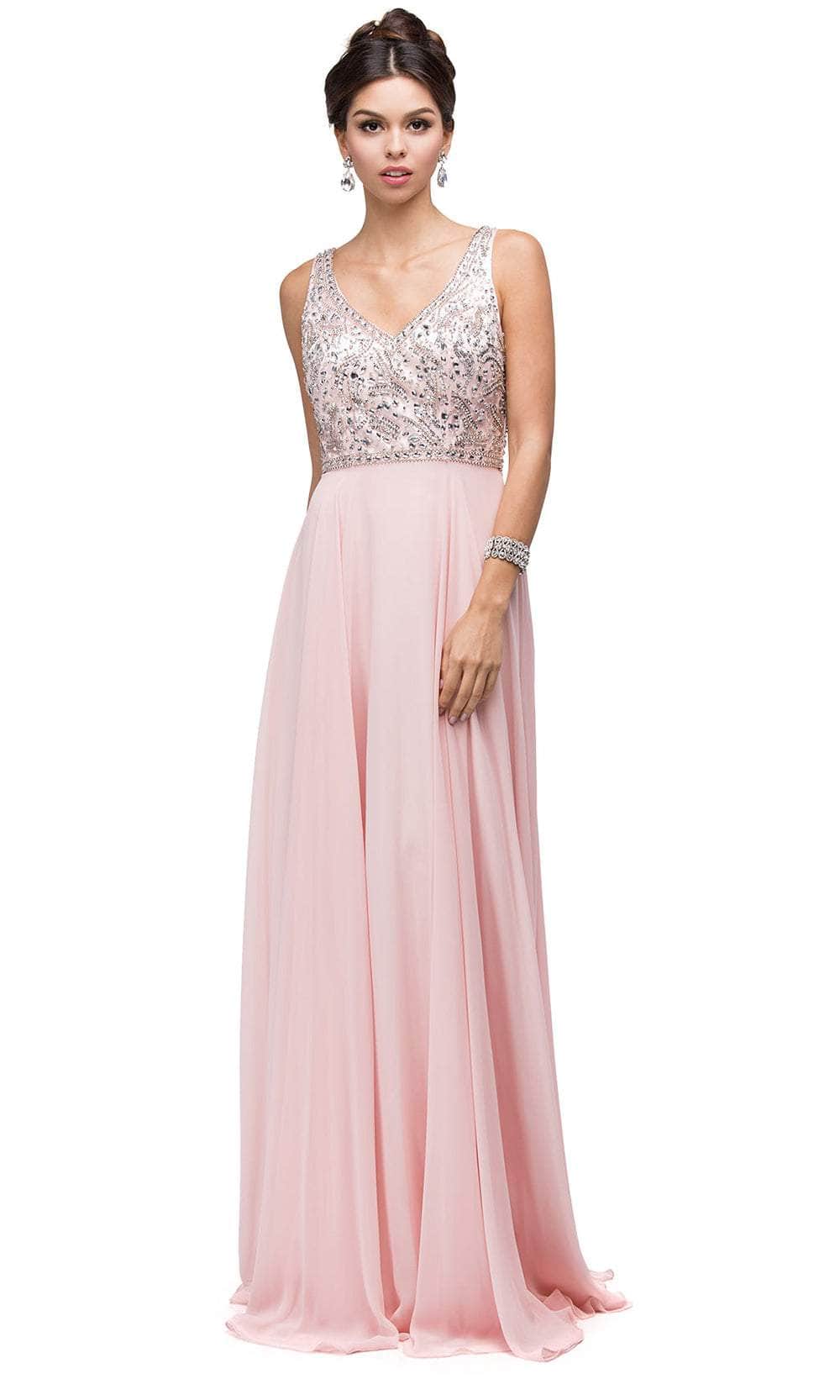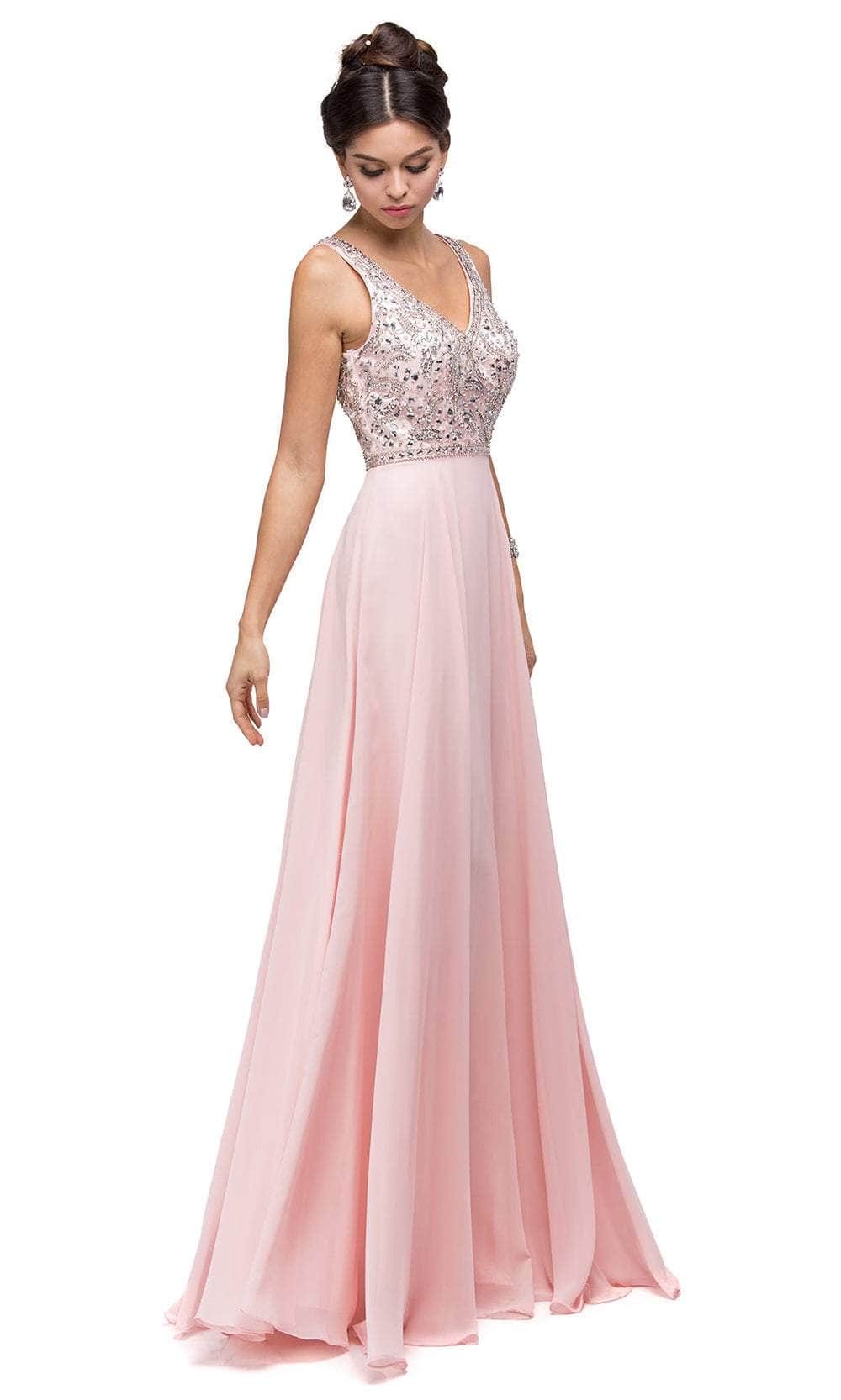 The Dancing Queen 9589 evening gown shimmers with a soft sheen, creating a breathtaking silhouette. Expert tailoring sculpts a flattering silhouette, highlighted by a plunging v-neckline and a sleeveless design that flatters your shoulders. The bodice shimmers with meticulously placed crystal details. A v-open back ensures both comfort and modern allure throughout the evening. The flowing chiffon skirt cascades to the floor in a graceful movement. This Dancing Queen 9589 masterpiece's intricate design shimmers like diamonds sprinkled under a starry night. Models are wearing the Aqua, Blush, Burgundy, and Champagne colors.