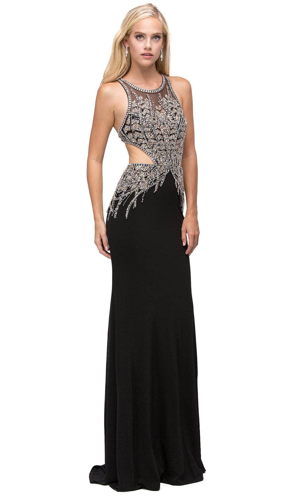 Savour timeless elegance with the Dancing Queen 9736 masterpiece. This sleeveless piece is decorated with crystal beaded embroidery on the illusion bodice for a luxurious and sparkling appearance. The cutouts on the side waist and racer back give a sultry touch, while the jewel neckline is also highlighted. With a back zipper for easy wear, the gown is completed in a flattering sheath skirt that softly cascades to the full-length hem and sweeping train. This Dancing Queen 9736 creation is a must-have for an unforgettable night. Model is wearing Black color.
