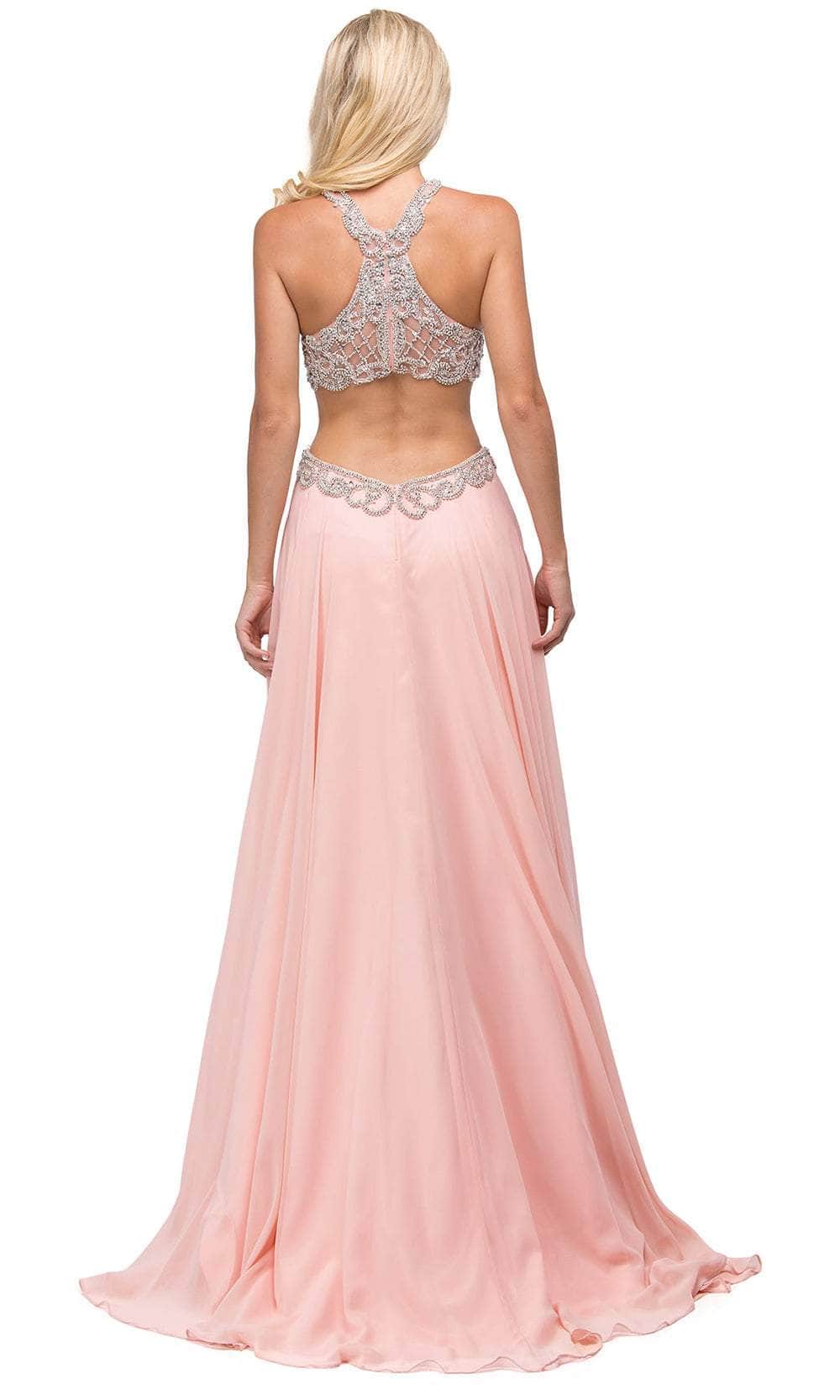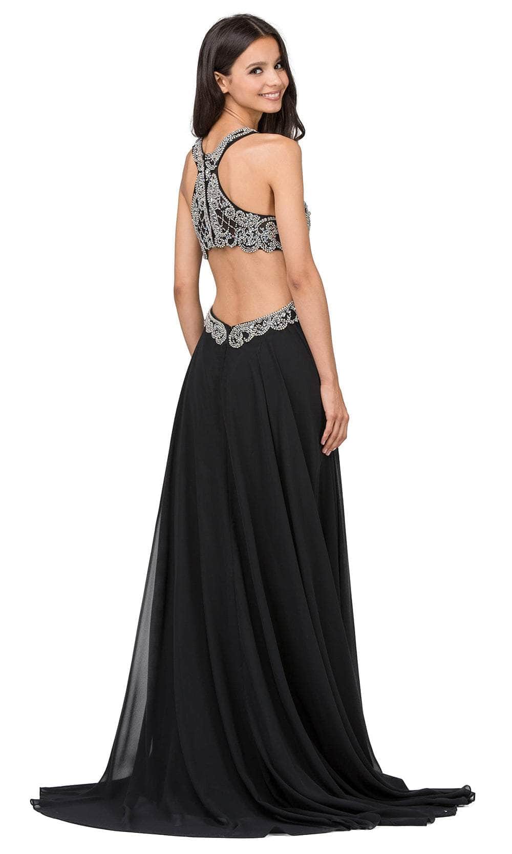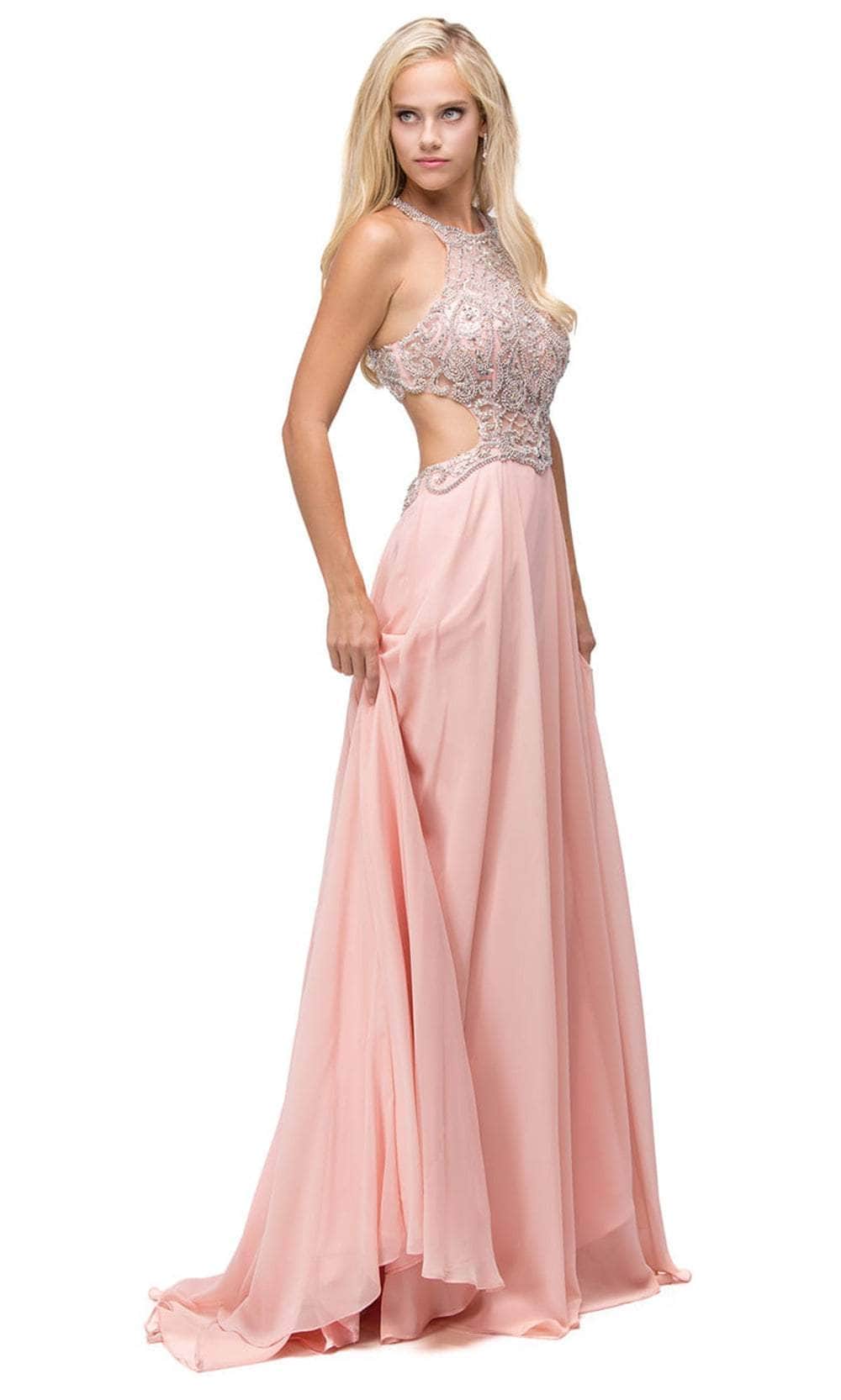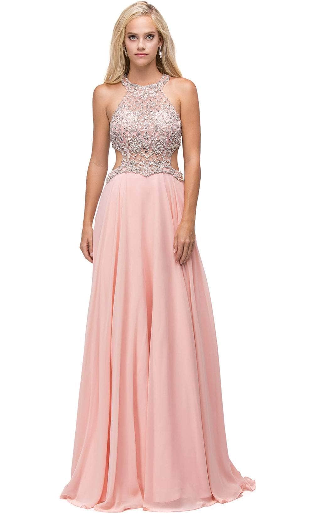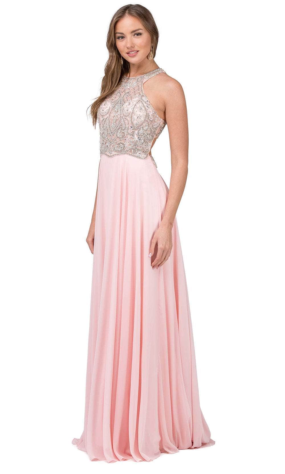 Step onto the red carpet with timeless elegance in the Dancing Queen 9740 masterpiece. This sleeveless ensemble is festooned with crystal beadings on the upper bodice, guaranteeing you sparkles and stand out from the rest. The halter neckline and racer back add a touch of allure, while the huge cutout detail at the back is sure to drop jaws. The flowy skirt is fashioned from chiffon and molds an A-line silhouette that drapes with poise to the sweeping train. Turn heads in this Dancing Queen 9740 creation. Models are wearing Black, and Blush colors.