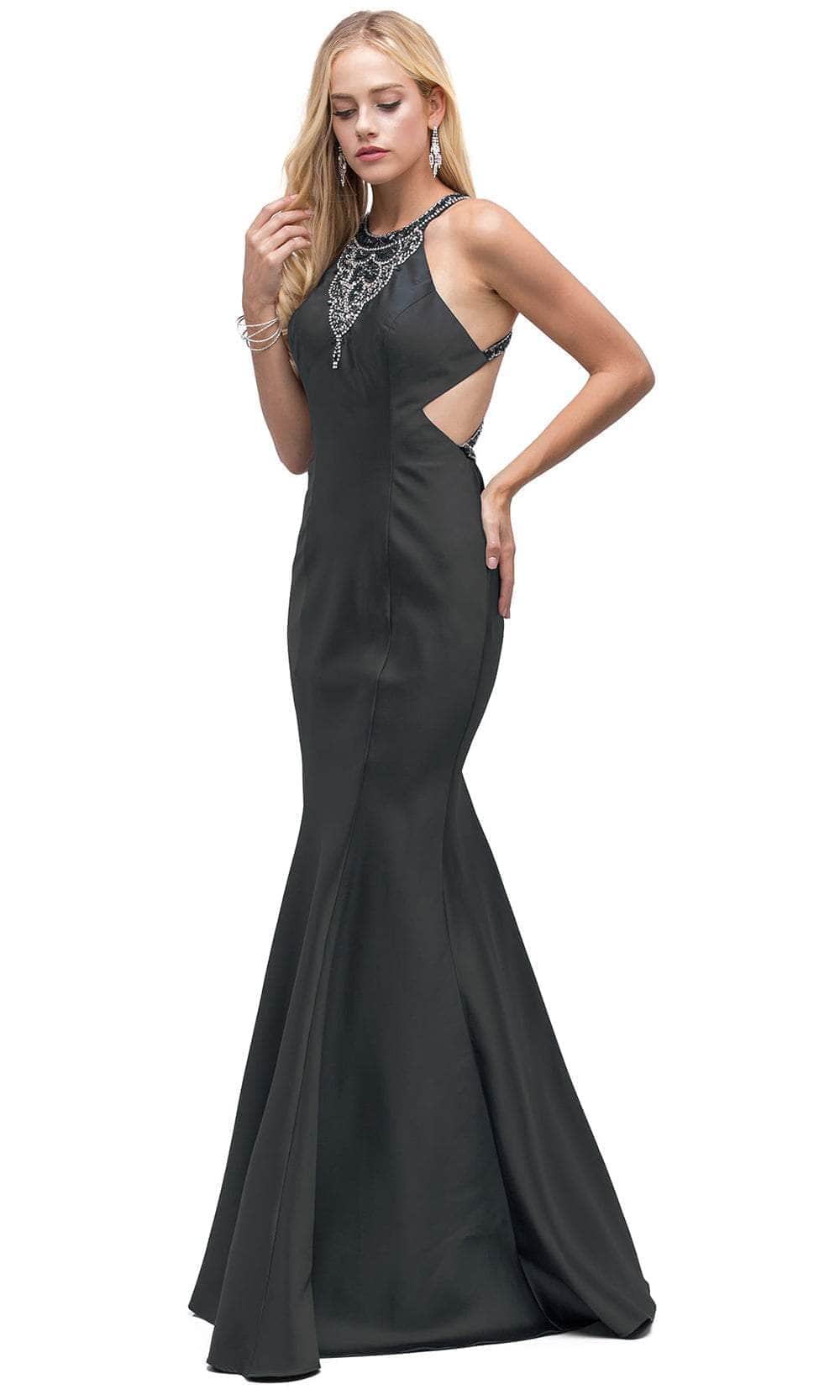 You will feel like a red carpet star by donning this Dancing Queen 9906 masterpiece. This gown is designed in sleeveless and has a princess seam structure to flatter your figure. It shows off a jewel neckline and a sultry cutout on the side waist. The beadings on the bodice are guaranteed to turn heads, while the strappy open back provides a modern twist. The skirt fits snugly around the hips and then flares at the bottom to sculpt a striking mermaid silhouette. Prepare to turn heads everywhere you go in this Dancing Queen 9906 creation. Models are wearing Black, and Champagne colors.