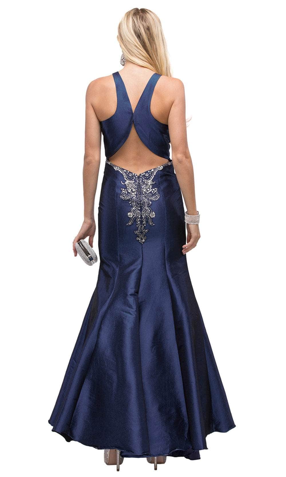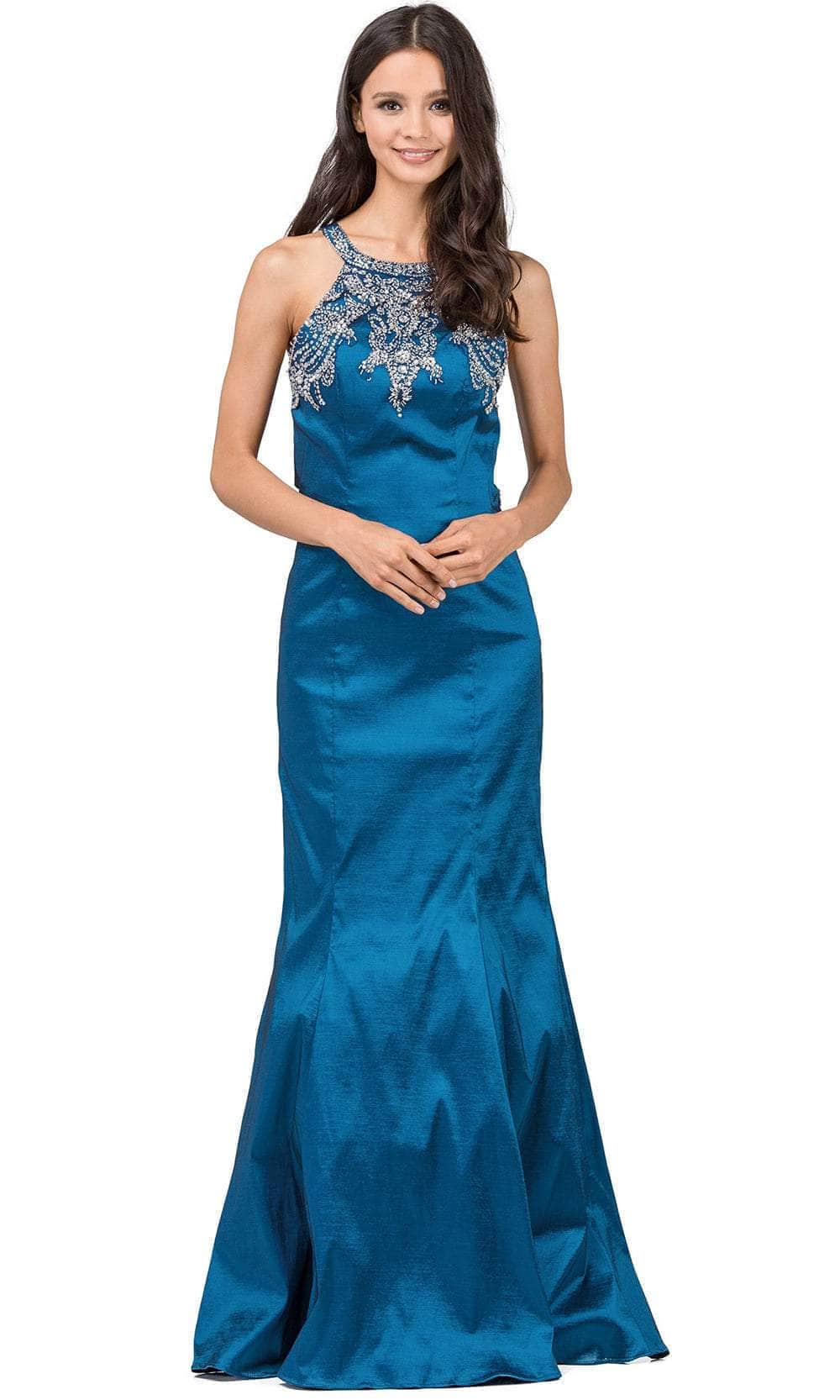 Embrace the enchantment of the Dancing Queen 9943 masterpiece. Perfectly tailored in princess seams to sculpt a flawless silhouette, the sleeveless ensemble envelopes you in luxury and elegance. It is adorned with shimmering crystal beading on the halter neckline and back. Additional highlights are the racer back with cutout detail for a contemporary allure. The skirt flourishes a mermaid silhouette that enhances your curves and ends in full length hemline. This Dancing Queen 9943 style is a must-have for any special event. Models are wearing Fuchsia, Navy, and Teal colors.