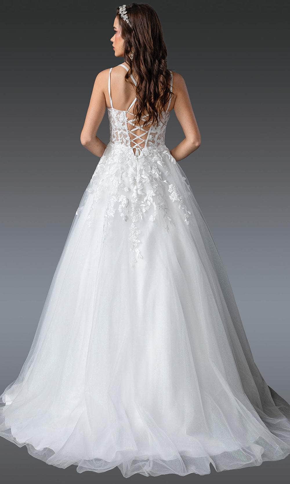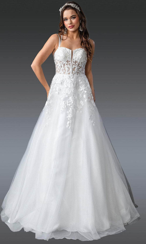 Let your bridal look bloom with the Dancing Queen Bridal 0281, a sleeveless gown that channels effortless romance. The sheer corset bodice features delicate floral lace appliques that gracefully trail down the soft A-line skirt. With slender dual straps framing a flattering sweetheart neckline, this gown offers a balance of modern and classic charm. Perfect for brides who desire elegance and softness, the Dancing Queen Bridal 0281 will make your wedding day feel like a fairytale. Model is wearing Off White color.