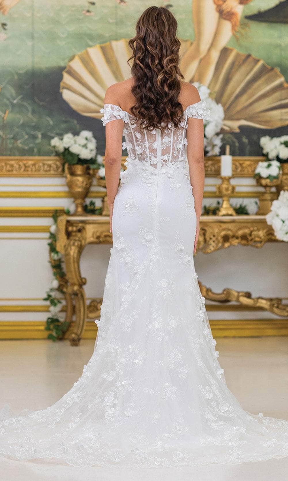Dancing Queen Bridal 0285 brings a striking combination of romance and allure to your wedding day. The fitted bodice features intricate 3D floral appliques over a sheer corset design, while off-shoulder cap sleeves beautifully accentuate the plunging sweetheart neckline. A daring high slit adds modern flair to the sheath silhouette, while a sweep train ensures elegance with every step. For brides seeking a fresh and captivating look, the Dancing Queen Bridal 0285 is a flawless choice for a statement-making ceremony. Model is wearing Off White color.