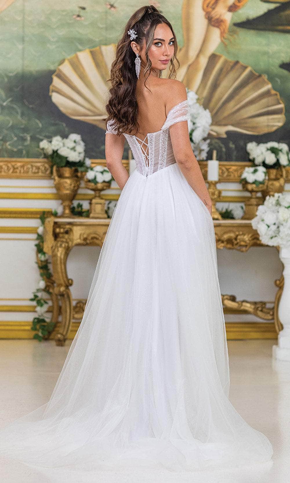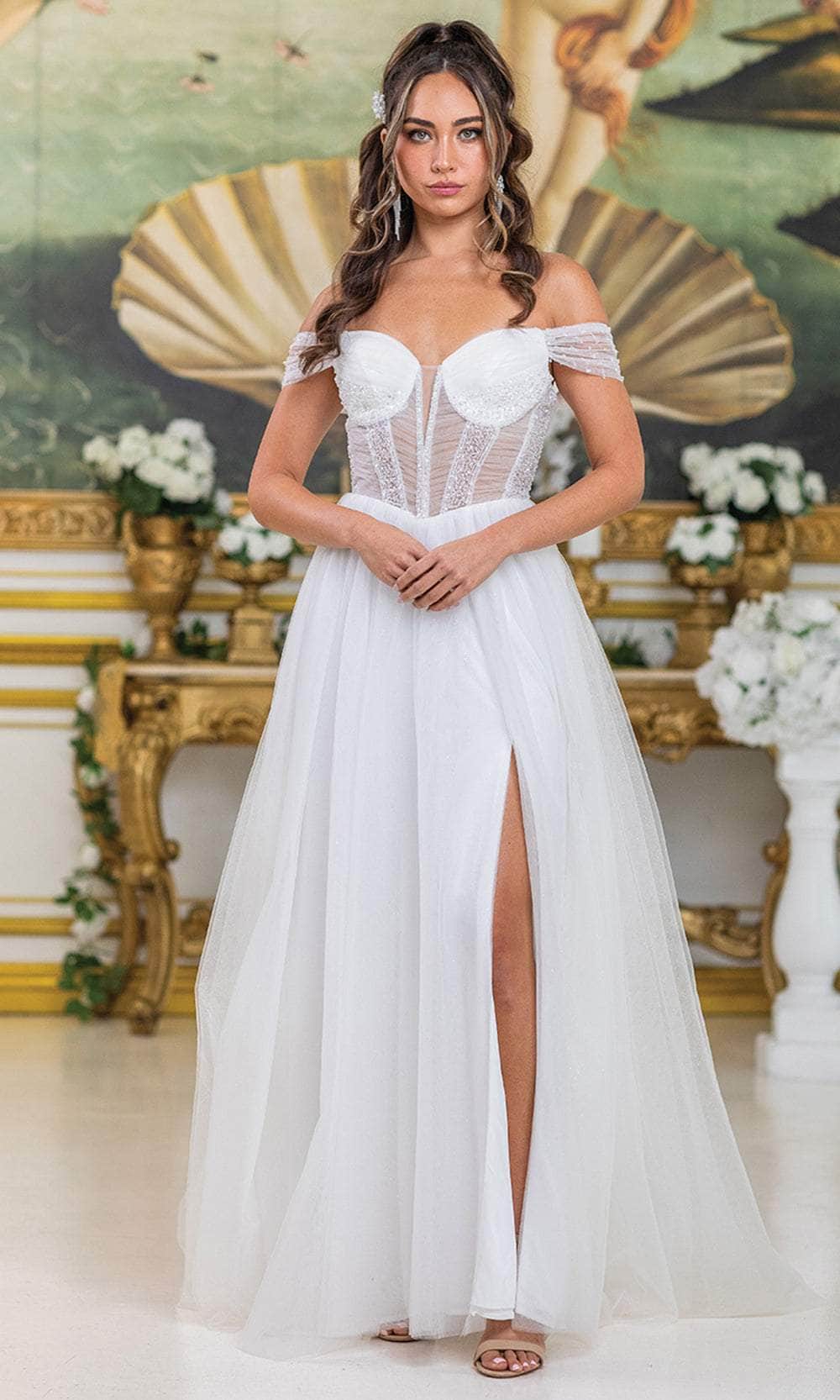 Celebrate modern bridal elegance with the Dancing Queen Bridal 0288, a design perfect for brides who favor simplicity with a contemporary edge. The sheer corset bodice enchants with ruched and beaded accents, while the off-shoulder sleeves and plunging sweetheart neckline creates a delicate, romantic frame. The airy A-line skirt ensures comfort and grace. A side slit brings a hint of drama to this ethereal gown. Brides who desire understated beauty and graceful movement will love the refined allure of the Dancing Queen Bridal 0288. Model is wearing Off White color.