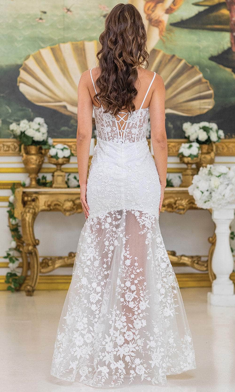 Delicate and bold, the Dancing Queen Bridal 0299 is perfect for brides who want a modern take on romance. The sheer corset bodice is adorned with floral lace appliques, complemented by dainty spaghetti straps and sweetheart. The sheer skirt reveals a high slit, giving the trumpet silhouette a playful yet sophisticated twist. The Dancing Queen Bridal 0299 is an exquisite choice for brides who want lightness and movement paired with intricate lace details and contemporary appeal. Model is wearing Off White color.