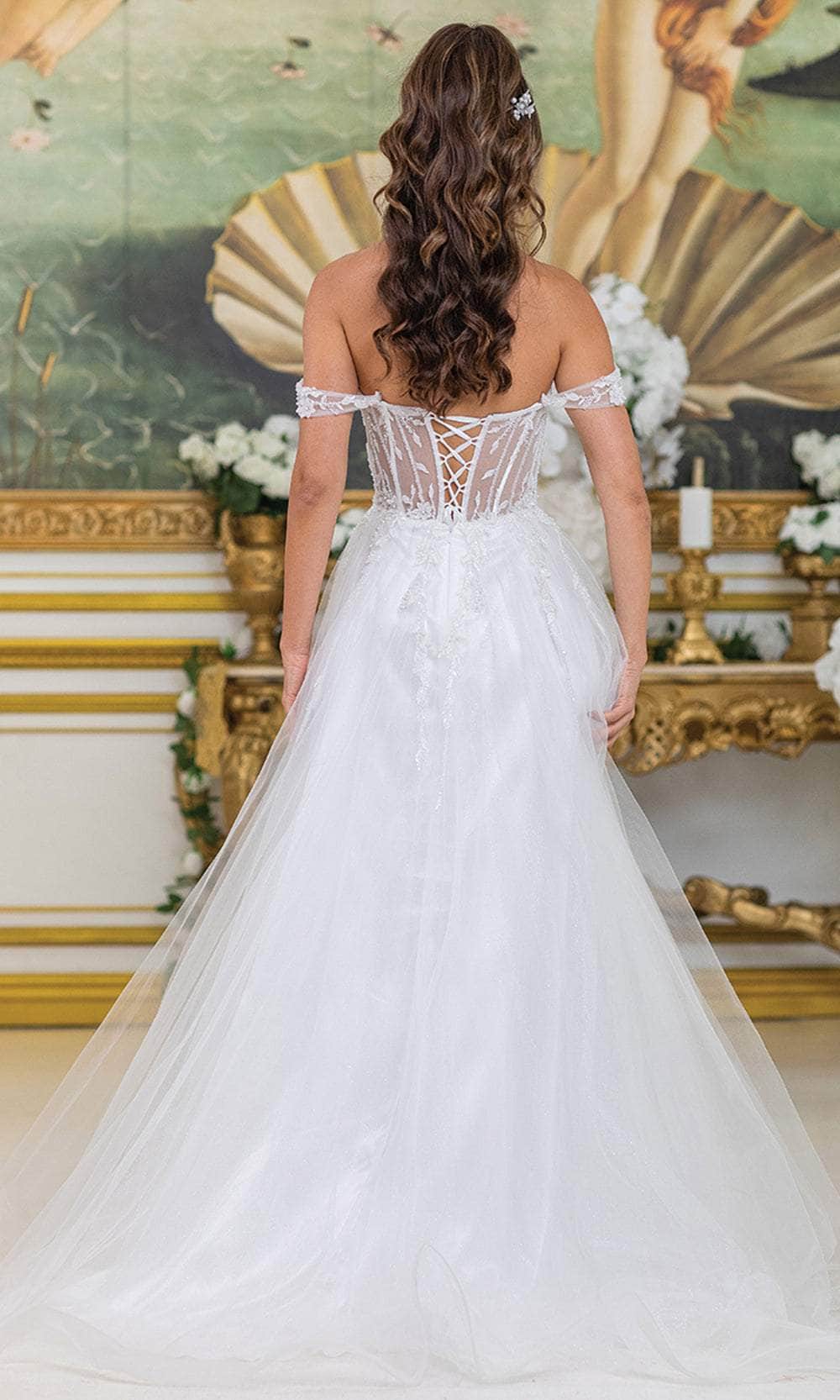 The Dancing Queen Bridal 0307 gown effortlessly blends modern design with soft romantic details. A sheer corset bodice adorned with floral lace appliques and beaded is framed by off shoulder sleeves. The layered A-line skirt flows beautifully with a thigh-high slit, offering a chic and daring twist to the bridal look. Perfect for the bride who wants to balance grace and boldness, the Dancing Queen Bridal 0307 promises a captivating presence from ceremony to reception. Model is wearing Off White color.