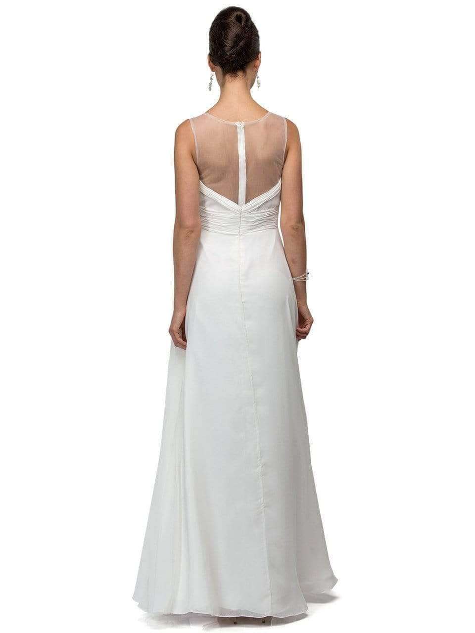 Be a woman of grace and gorgeousness in this Dancing Queen Bridal 9539 dress. Sheer mesh forms the sleeveless shoulder straps and illusion back on this empire-waist ruched dress. The lovely chiffon skirt is pleated in front for added fullness. Figure-flattering ruching adorns the V-neck bodice and jeweled empire waist. This Dancing Queen Bridal 9539 style is a sure standout on your next evening social event. Models are wearing the Black, Blush, Burgundy, Dusty Lilac and Off White colors.