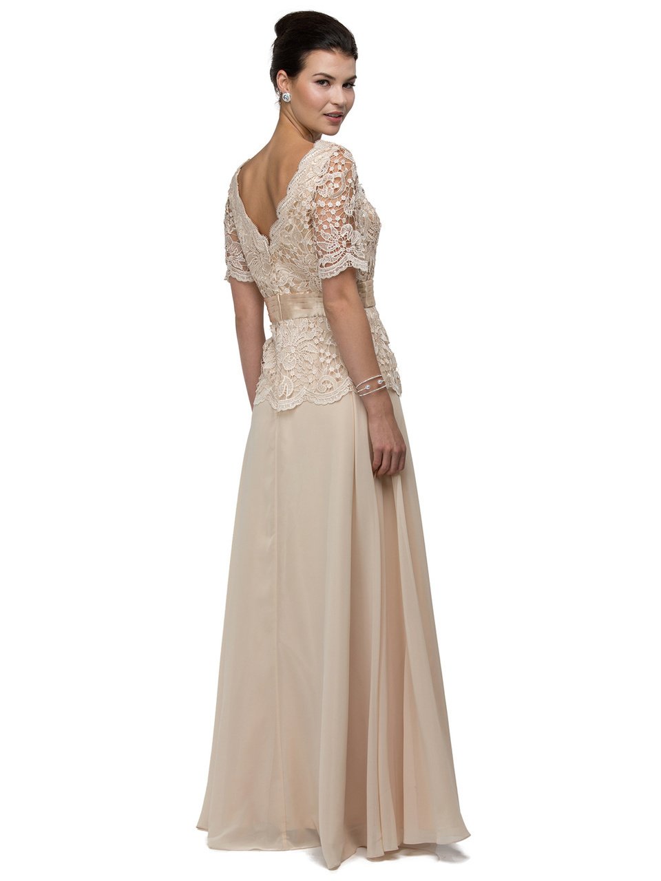 Glide into any party with an awe-inspiring effect among the crown in this creation. This stunning number shows a v-neckline, v-open back and short sleeves. The bodice is dominated by a lace fabric. Cinched at the waist by a satin bow, the A-line full-length hem flows to the floor flawlessly at a sweep of train. Make an exceptional vision in this delicate dress. Model is wearing Gold color.