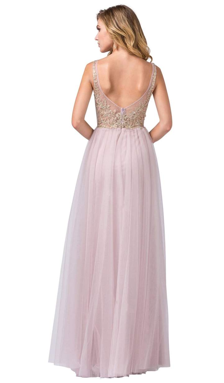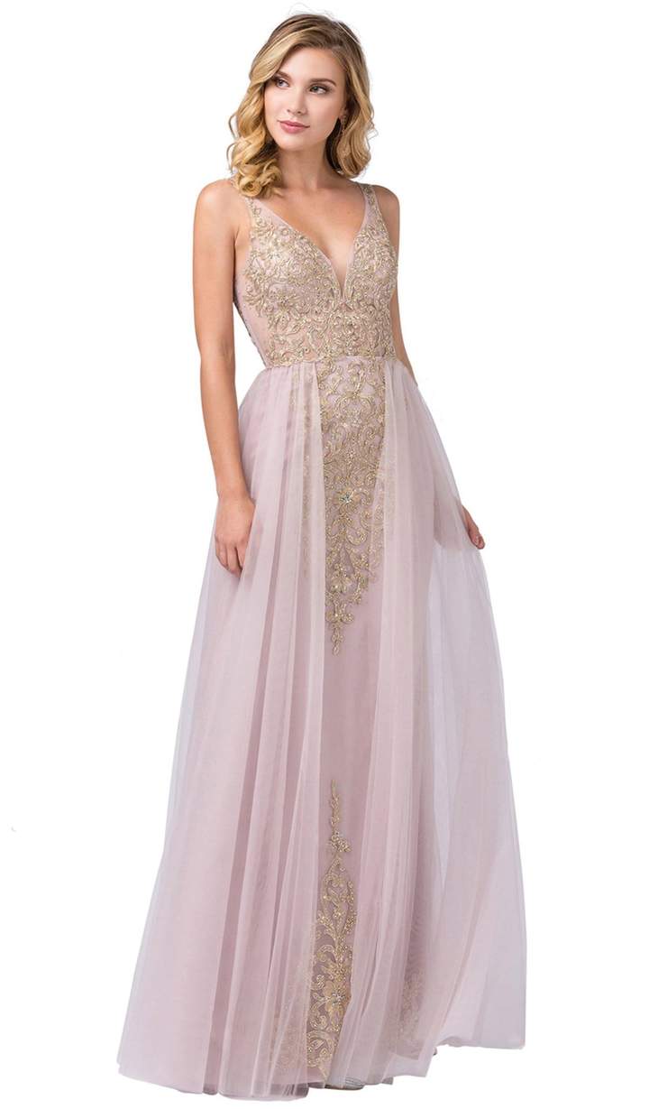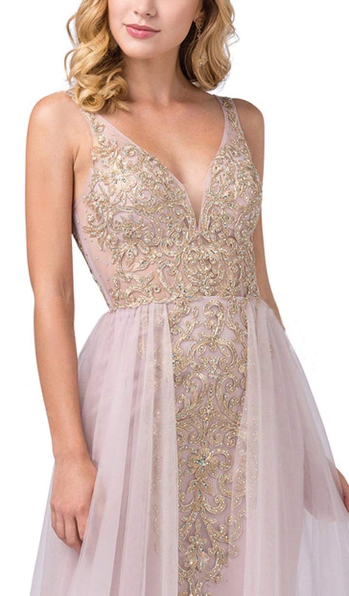 Enticingly designed with gilded lace appliques mingling with rhinestones, this beauty presents a plunging v-neckline paired with a scoop illusion back. The ornate inner skirt is stunningly overlaid with a gossamer overskirt.