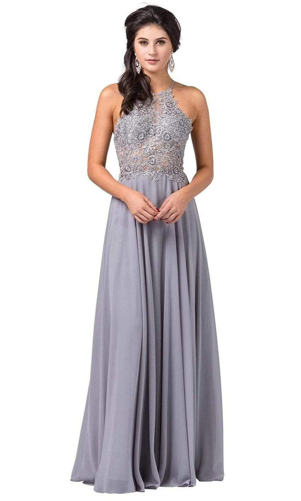 Ornate with beautiful lace appliques, the dress has a sleeveless, halter neckline with a form-fitting bodice. The back has a zipper closure and from the waist begins a full length flowy A-line skirt.