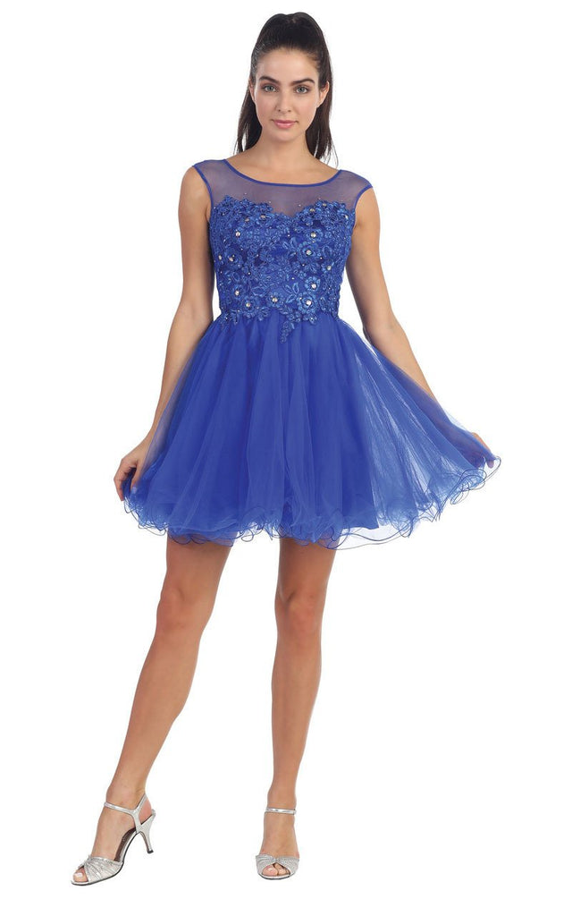 Show off your lovely bodice in this amazing dress from Dancing Queen 8881. This dress boasts gorgeous floral applique detail, bateau neckline, sheer cap sleeves fabric at the upper portion. This delicate A-line style flows down in a pleated, mini hem. Capture the glamour as you walk on this stunning gorgeous Dancing Queen creation. Model is wearing Royal Blue color.