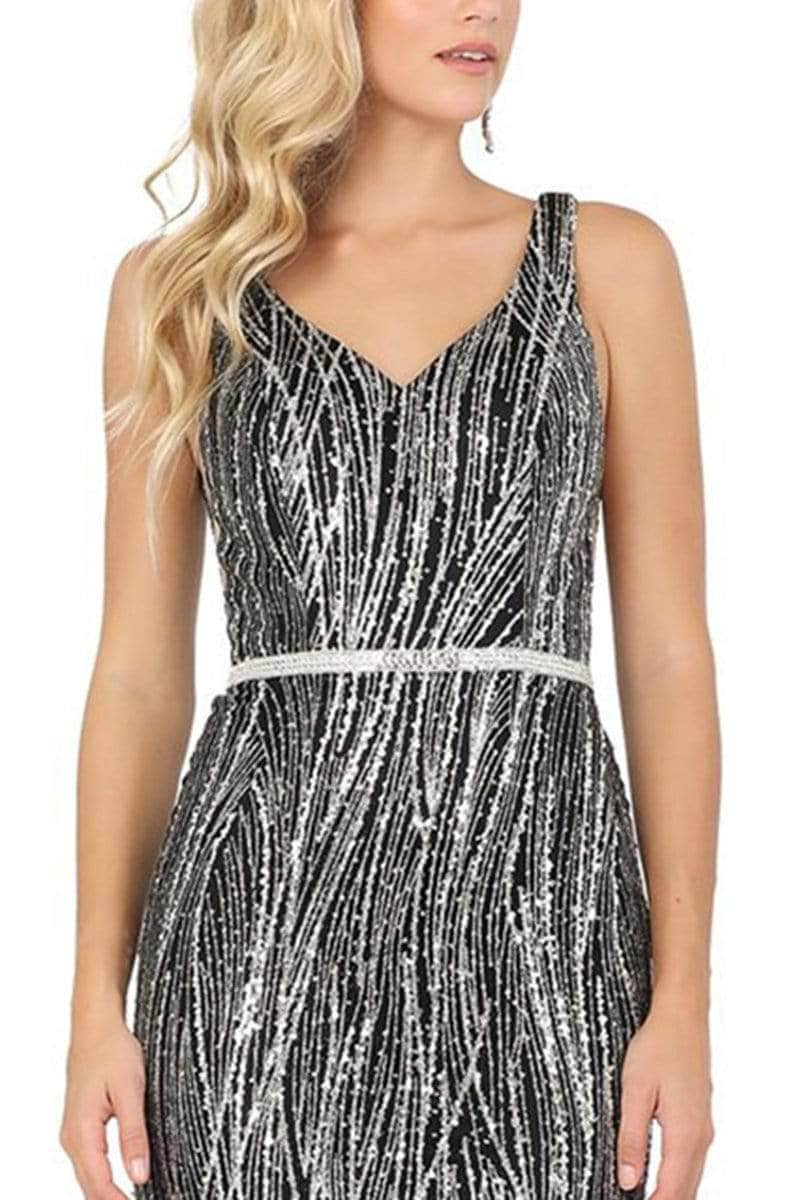| Details: | Glitter Motif, Sleeveless, Beaded Waistband, Sheer Plunged Sides, Deep V-Open Back, Back Zipper Closure, Sweep Train |