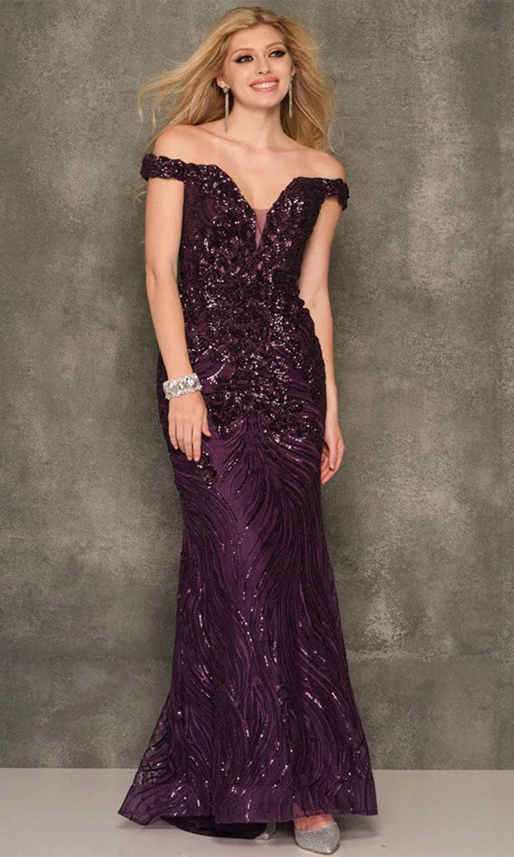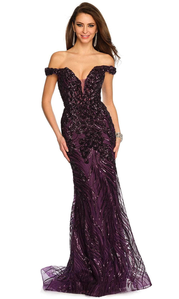 Every component of the enchanting Dave & Johnny 11002 combines sophistication and magic, an exquisite gown crafted from sequin tulle fabric. The plunge V-neckline, enhanced with a sheer insert, sets the stage for a captivating look. The off-shoulder fitted bodice, adorned with beads, adds a touch of elegance. A concealed zipper closure ensures a seamless fit and a natural waistline beautifully defines the silhouette. The floor-length fitted skirt gracefully parades in a trumpet silhouette, concluding with a train. Dave & Johnny 11002 effortlessly combines modern allure with timeless sophistication, making it a striking choice for any special occasion. Model is wearing Purple color.