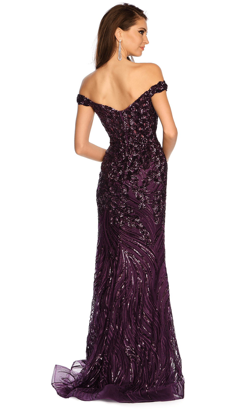 | Details: | Off-Shoulder, Sheer Insert, Back Zipper Closure, Train |