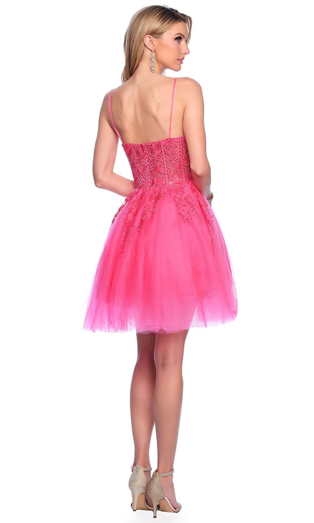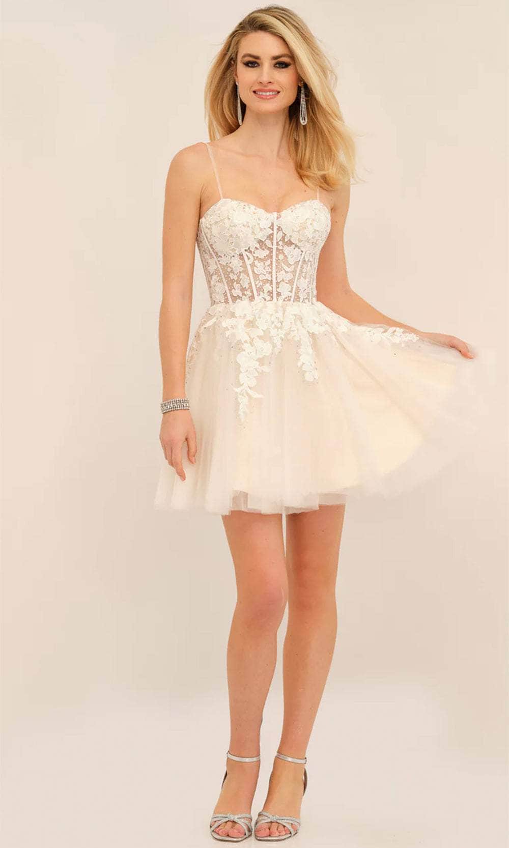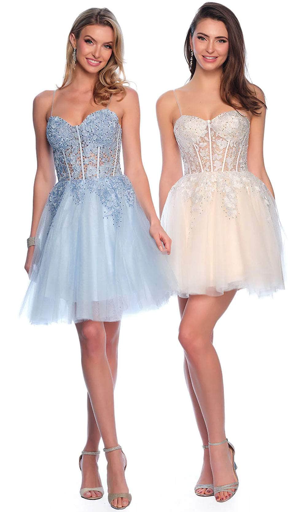 Grab the limelight in this creation from Dave and Johnny 11206. This sleeveless beauty showcases an illusion corset bodice with exposed boning, sparkly beads, and floral embroidery. The thin straps that outline the shoulders keep you comfortable and exquisite. Other features are a sweetheart neckline and mid-open back with concealed zipper closure. The layered skirt flares an A-line silhouette that falls to the playful short hemline. Let the party begin with this Dave and Johnny 11206 cocktail dress. Models are wearing Fuchsia Pink, Ice Blue, Ivory, and Lilac colors.