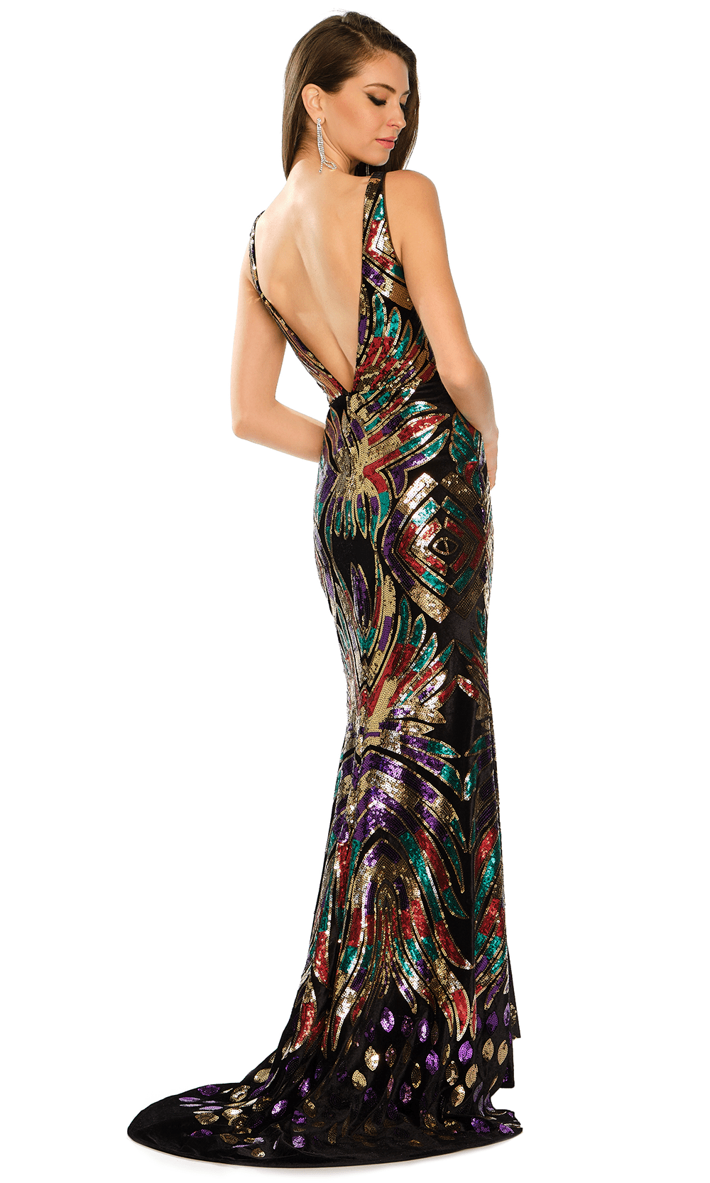 Dive into glamour with Dave & Johnny 11281, a stunning gown tailored from Novelty Velvet fabric. The V-neck plunge, adorned with a sheer inset, sets a captivating tone. The sleeveless bodice complements the deep V-back, secured by a concealed zipper closure, for a seamless fit. A natural waistline beautifully defines the silhouette. The full skirt gracefully cascades in a mermaid silhouette, concluding with a train. Dave & Johnny 11281 effortlessly combines modern allure with timeless elegance, making it a show-stopping choice for any special occasion. Model is wearing Black/Multi color.