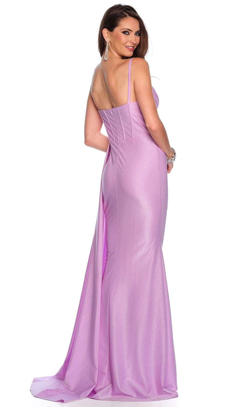 Illuminate the scene with Dave & Johnny 11495, a spectacular gown crafted from shimmer jersey fabric. The sleeveless corset bodice, adorned with a sweetheart neckline and ruched cups, exudes timeless sophistication. Delicate spaghetti straps offer graceful support, and the central zipper closure at the back ensures a seamless fit. The floor-length sheath silhouette of the skirt is enhanced by a side-high slit and a side sash, concluding with a train. Dave & Johnny 11495 seamlessly merges modern allure with timeless elegance, presenting a captivating choice for any special occasion. Model is wearing Lilac color.