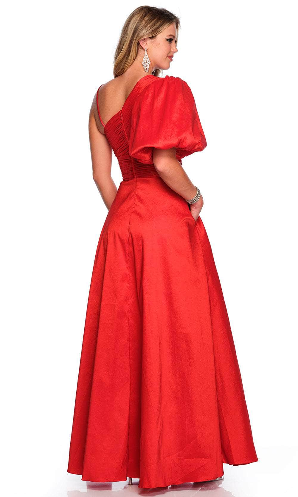 With flair and grace, steal the center stage with this masterpiece by Dave & Johnny 11577, an exquisite gown tailored from luxurious Taffeta fabric. The ruched bodice, featuring a one-puff sleeve and a single spaghetti strap on the other side, adds a touch of modern flair. A back zipper closure ensures a seamless fit and the empire waistline enhances the silhouette. The floor-length fitted skirt, complete with convenient side pockets, parades in an A-line silhouette that is accentuated by a high slit. Dave & Johnny 11577 effortlessly combines contemporary style with timeless elegance, making it a captivating choice for any special occasion. Model is wearing Red color.