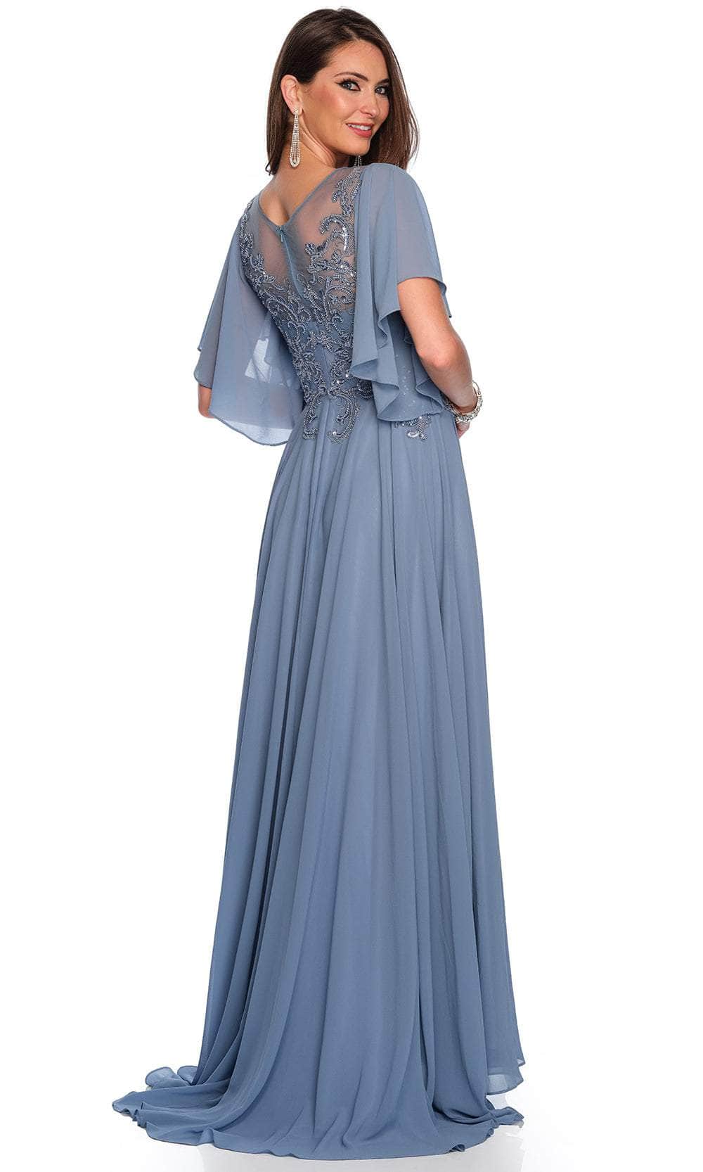 Bring on impressive beauty in this Dave & Johnny 11676 masterpiece. The exquisite gown has a fitted top adorned with a swirl pattern of beadwork and sequins, making a mesmerizing and sparkly effect. It displays a beautiful illusion jewel neckline with sweetheart lining, and short flutter sleeves. The partial illusion back highlights the v-shaped cut and center zipper closure. Sculpted in an A-line silhouette, the skirt flawlessly descends to the floor and sweeping train. This Dave & Johnny 11676 gown gives you a glamorous look that will last a lifetime. Model is wearing Smoke Blue color.