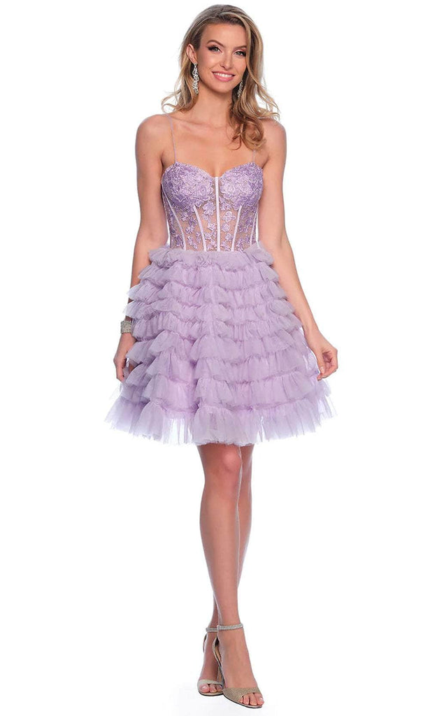 Fall in love with this attention-grabbing Dave and Johnny 11766 creation. The dress is stunningly designed in sleeveless, and has an illusion corset bodice that gives it a structure and perfectly tailored fit. The spaghetti straps frame the shoulder and sweetheart neckline beautifully. In addition, the midrise back provides a comfortable and flattering fit with its strappy lace-up tie closure. Accented with the ruffle tiered that adds a playful twist, the tulle skirt widens into an A-line silhouette that reaches the short hemline. This Dave and Johnny 11766 short dress is a chic option for any special occasion, especially a cocktail party. Model is wearing Lilac color.
