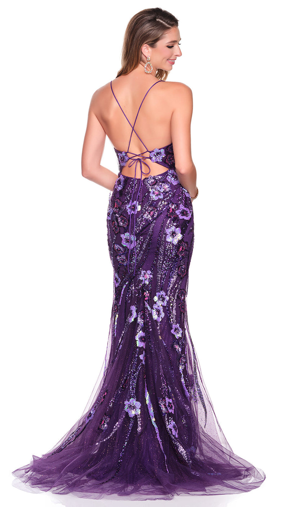 Poise meets enchantment in the captivating Dave & Johnny 12569, a gown that captures both strength and softness in every glance. A plunging v-neckline introduces the structured bodice adorned with shimmering floral appliques that glisten under the light. Illusion side panels define the waist beautifully, while the sheath skirt opens into a thigh-high slit for a graceful stride. The Dave & Johnny 12569 masterpiece radiates garden-inspired glamour perfect for red-carpet elegance or prom nights that demand attention. Model is wearing Purple color.